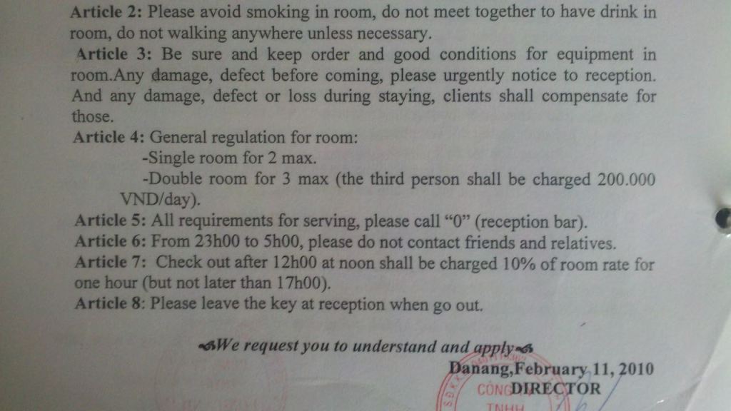 And on that note, I thought I would post the hotel’s ominous guest warnings – particularly regarding no contacting of friends and relatives and no leaving the hotel. What kind of communist regime would do such a. . .oh right. Though I think more likely something got lost in translation (or whatever I have to say to prevent my blog from being blocked). And that’s about as exciting as it gets here in Danang.