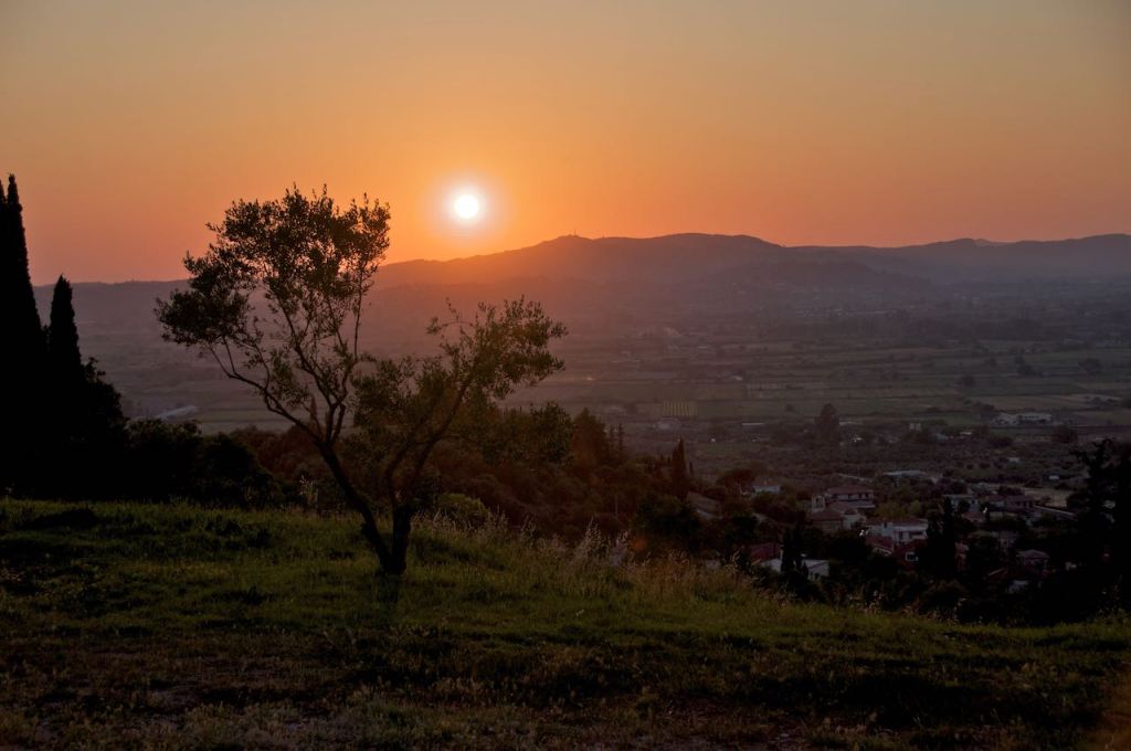 For anyone who cares to know, I got my first meal of the day. I took this picture while sitting at our table at the Best Western and eating lamb and potatoes. This all happened just in time, as the folks damn near killed me off today. When I get hungry, I get mean, but this can easily be avoided. At the completion of my one meal today, I was able to catch a nice sunset over the plains around Olympia. Tomorrow we go to Delphi to see the site of the ancient oracle. It’s a long drive, but as long as I get fed, I’m sure it will be ok.