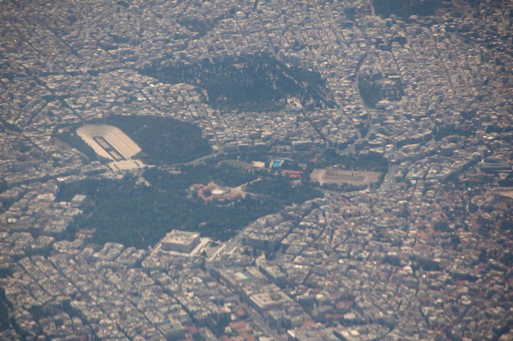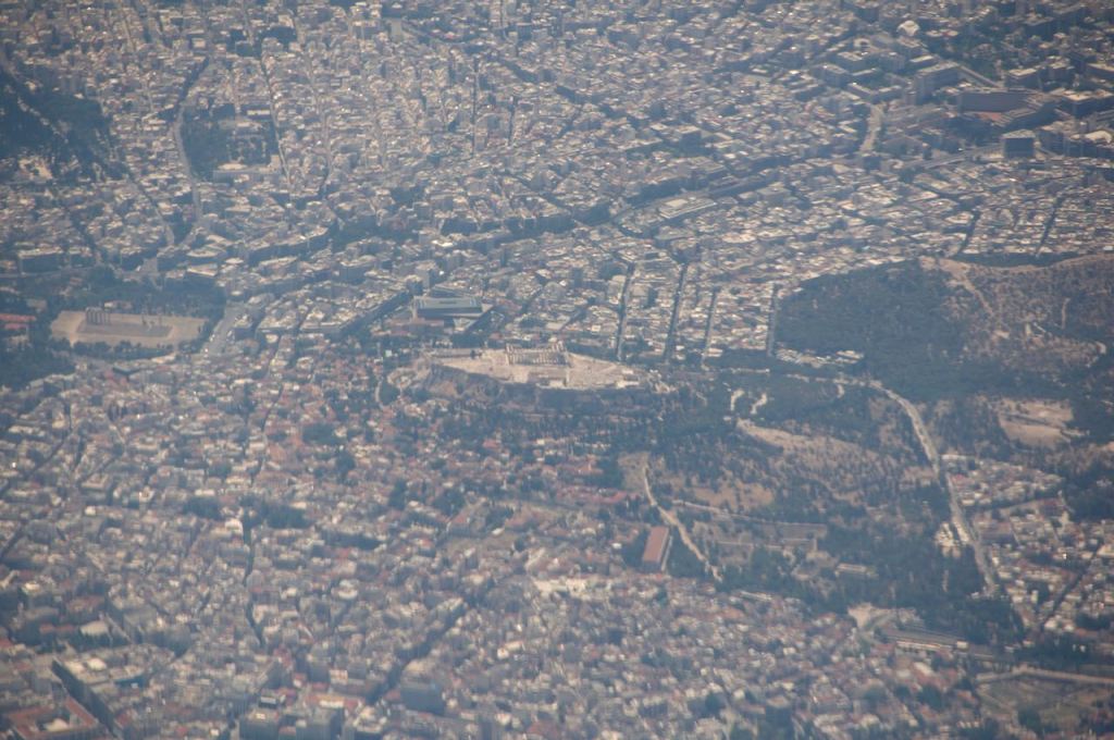 As predicted, this Air Canada flight has no in flight entertainment. While they do have the screens in front, there is obviously no choice of film. In fact, they ran out of movies just 5 hours in to the flight. They almost repeated Man on a Ledge, but after I saw it once, I was able to verify that it is indeed about a man on a ledge. Of interest, however, was our flight path out of the Athens airport. We made a long, lazy curve during climb-out that took us over the city. In the center of this photo is the Acropolis, though a bit fuzzy.