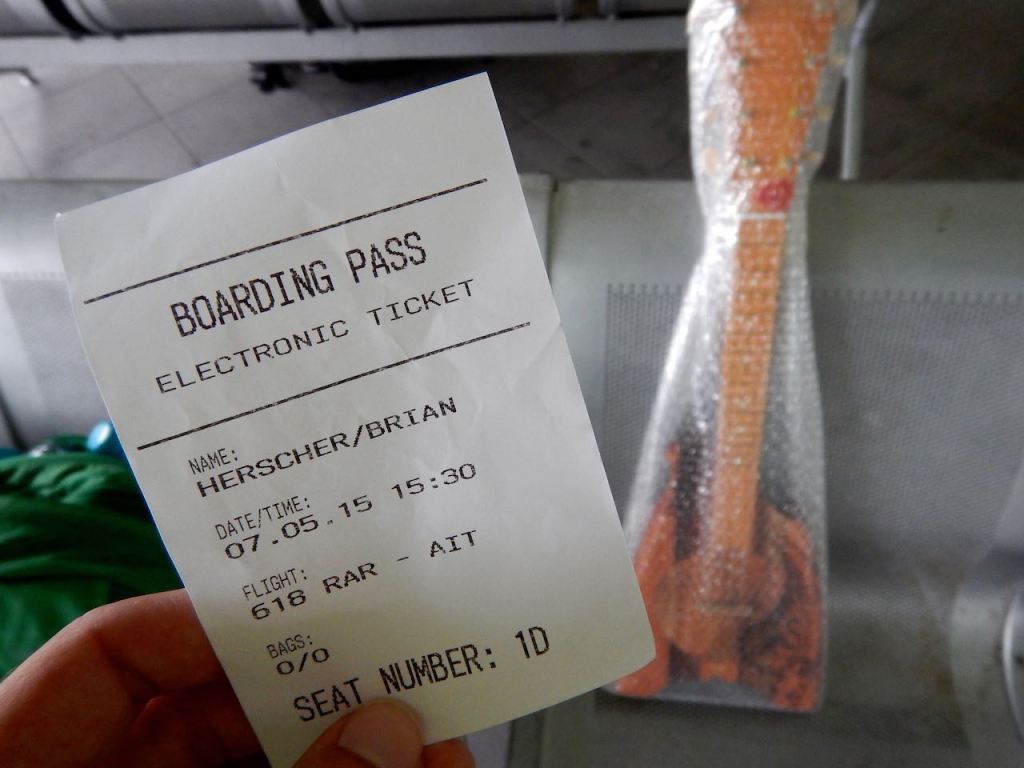 Now we wait in the Rarotonga airport for our flight to Aitutaki. Here’s a look at the new uke (in bubble wrap) behind my extra fancy boarding pass. We didn’t even have to go through security!