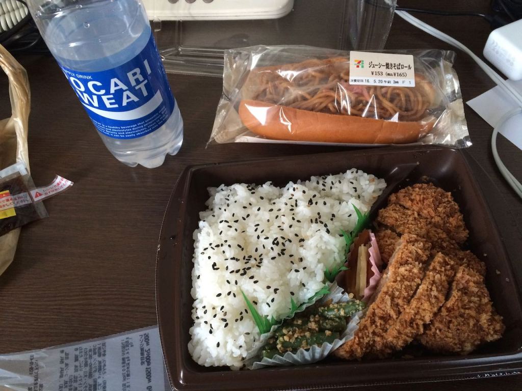 Next we went to pick up our Japan Rail passes, which was like a comedy of errors. We went to the information booth at Shibuya Station and we kept getting redirected from one booth to the next until FINALLY we had our rail passes in hand. We took the Yamanote circular line back to Shinjuku. This time we took it the correct way and stopped off at a 7-11 to get some food. I purchased some katsu chicken and rice with some sort of thing that I can only describe as spaghetti stuffed into a hot dog bun. I researched later and this is called Yakisoba. Nicole unknowingly ordered the most popular item at 7-11, a pair of onigiri — triangular rice blocks filled with salmon and wrapped in seaweed. I am not sure if it was a cause-and-effect situation, but when we got back to the hotel to rest for a little bit, Nicole began vigorous research on where to get dinner.