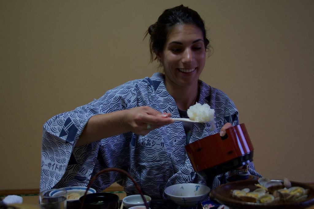 We dropped our things off at the ryokan (a traditional style of Japanese inn) and proceeded to check out the famous red torii gate. It was low tide, so we could walk out to it and take some pictures. We weren’t out too long because we had to be back in time for our traditional Japanese dinner. We put on our yukata and sat on the floor as we were served all kinds of . . . interesting looking food items. Of what I know, or could identify, we had oysters, eel tempura, beef salad, sashimi, cabbage stuffed with meat, some sort of weird soup with whole fish in it, and a salad.