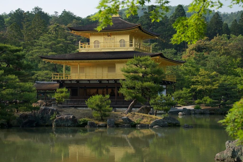 People sit at Ryoan-Ji to mediate on its meaning. Personally, I just think the creator thought the spacing of the rocks looked good and called it a day. But not everyone has such firsthand experience in creating Japanese rock gardens. Look at mine, for example. Does it symbolize the battle between good and evil? Is it a map of secret Pacific islands? Or perhaps it is a reenactment of the naval formations at the Battle of Midway. After our visit to Ryoan-Ji, we took a taxi to Kinkaku-Ji, which is better known for its “Golden Pavilion.”