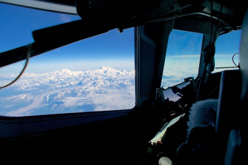 I haven’t the faintest idea how these things happen, but we got on. We overnighted in Anchorage at a small b&b near the airport and even at this latitude in southern Alaska, the sun’s light made itself known at midnight from just beyond the horizon. The next day I ran into another oversold situation going to Prudhoe Bay. Evidently it is a popular destination. Nicole had a confirmed seat, and for the first time in months I asked for the jumpseat. In the end, this wasn’t terrible. I had good views of Mt McKinley Denali, something that was obscured during my last visit to Alaska, over six years ago.
