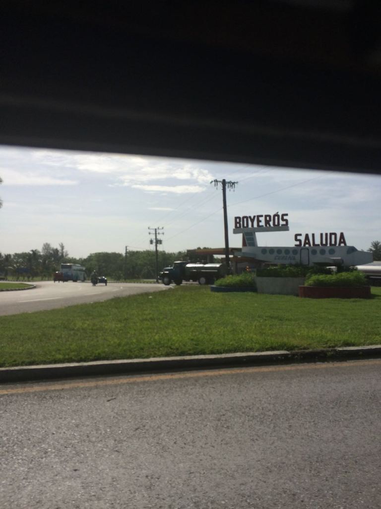 Our driver was driving a Lada from old Soviet days. Every bump we hit in the road caused me to launch out of my seat and almost hit my head on the ceiling. There were no seatbelts . . . or apparently shocks. We made excellent time, getting to the airport in about 2 hours including a stop for gas. Evidently there has not been gas in Viñales for two days, so we waited in line at a service station. We were also stopped by La Policia at a checkpoint. It was not really clear what was happening. I could only pick out a few words as they stared at Greg in the front seat. I heard them say, “Adelante” or go ahead, but both the driver and the police were giving Greg the stare down so I have no idea what was happening. Based on some contextual clues, the best I can figure is that the police were suggesting we take a different road and the driver was confirming if this was ok with Greg of all people. Greg turned around to look at me for help, but was only met with shrugged shoulders. I was afraid we were going to have to pay a bribe or end up in Cuban jail. Luckily neither of these happened.