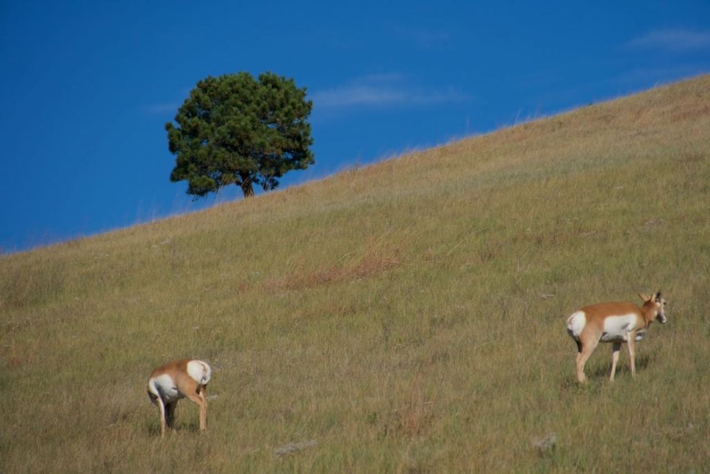 The bison were all corralled behind fences, so it wasn’t some kind of majestic migration across the plains we were hoping for, but we did see plenty of antelope roaming the hills. It was a long, winding drive around the park. Eventually we stopped to get some lunch, where I ordered a buffalo burger. One would assume it would be fresh, but the place overcooked it until it was dry and void of taste. Following our exit from the park, we drove back through Rapid City making a quick stop at Dinosaur Park with very natural-looking green dinosaur sculptures and then hit the road toward Wall.