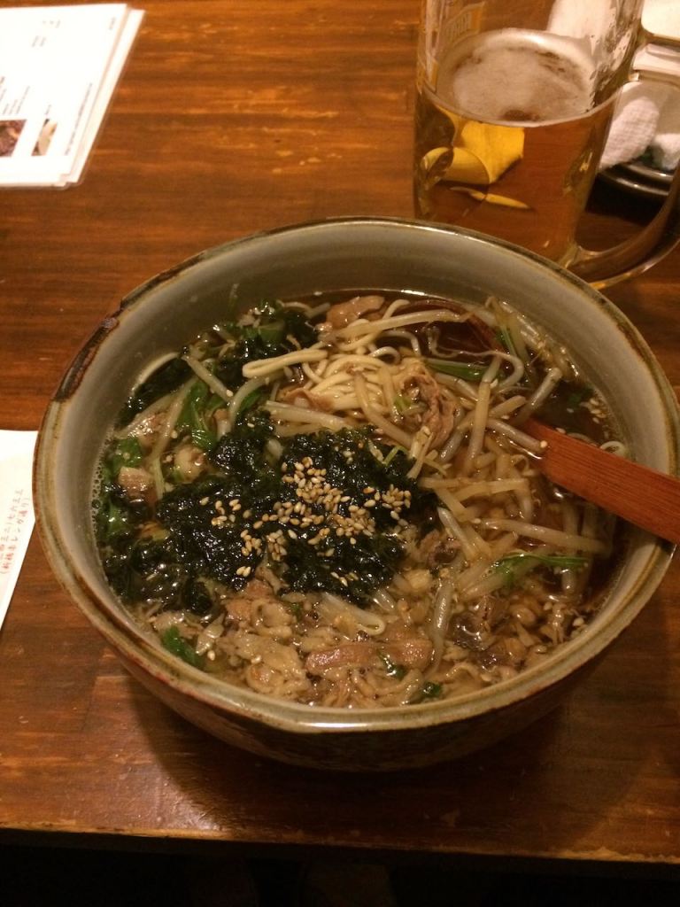 Thanks to our lack of skills with the Japanese language, it took us a while to find a place to eat. There were numerous restaurants in the area, but we didn’t want to go into one that was filled to the brim and with a line out the door, since it was actually quite cold outside. Most of the menus were entirely in Japanese with few pictures to fill in the gaps. We were about to go downstairs into one when a man emerged and a confused exchange took place. There was some kind of miscommunication and he was instructing us to go to the restaurant upstairs, which was a completely different establishment with completely different menu. Eventually we found a place whose name was entirely in Japanese, but they had one sentence in english claiming to have an english menu. After another confused exchange we were sat down at a booth that was encaged in its own sort of room. Also, when I was trying to shuffle around the sliding door to sit across from Nicole within the semi-enclosed room, it appeared that I was being instructed not to do this and to sit next to Nicole instead.
