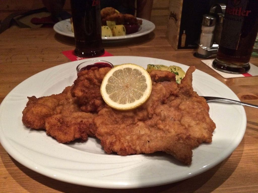 We took the train into town, which took us just 15 minutes. Then we were hit by a blast of cold air as we entered a literal winter wonderland. Air travel is a fascinating thing. One day you’re looking at elephants in the jungle, and the next you’re making sure you don’t step in slush from the last snowfall. After checking in to our hotel near the city center, we got some dinner at a casual restaurant nearby. It seemed popular with the locals. Nicole and I had a wiener schnitzel with potatoes and beer. It was our first meat in more than a week…unless you count the ham and cheese panini served by Austrian Airlines, which Nicole described as the best meal of her life.