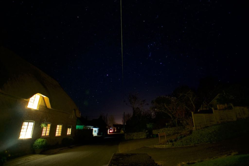 Nicole had a steak and I had the fish n’ chips. For the second time this trip, it was served with mashed peas. This is an aspect of the fish n’ chips order that has not taken off in America and I’d be interested to know how exactly I’m supposed to eat them. Do I dip the fish in it? Do I eat it straight up? Are they for the chips? The world continues to surprise me. After a most hearty dinner, we slowly drove back in the pitch black night. The strong winds seem to have pushed a lot of the clouds out of the way, and we could see lots of stars. Unfortunately when we got back to the Yalbury cottage, the lights from their restaurant and the motion sensing lights in the car park proved to be too much light pollution for good star pictures. Nevertheless, we walked around to the street-side to make the best of it. There were some power lines that were unavoidable in our shots, but this was the end result . . .