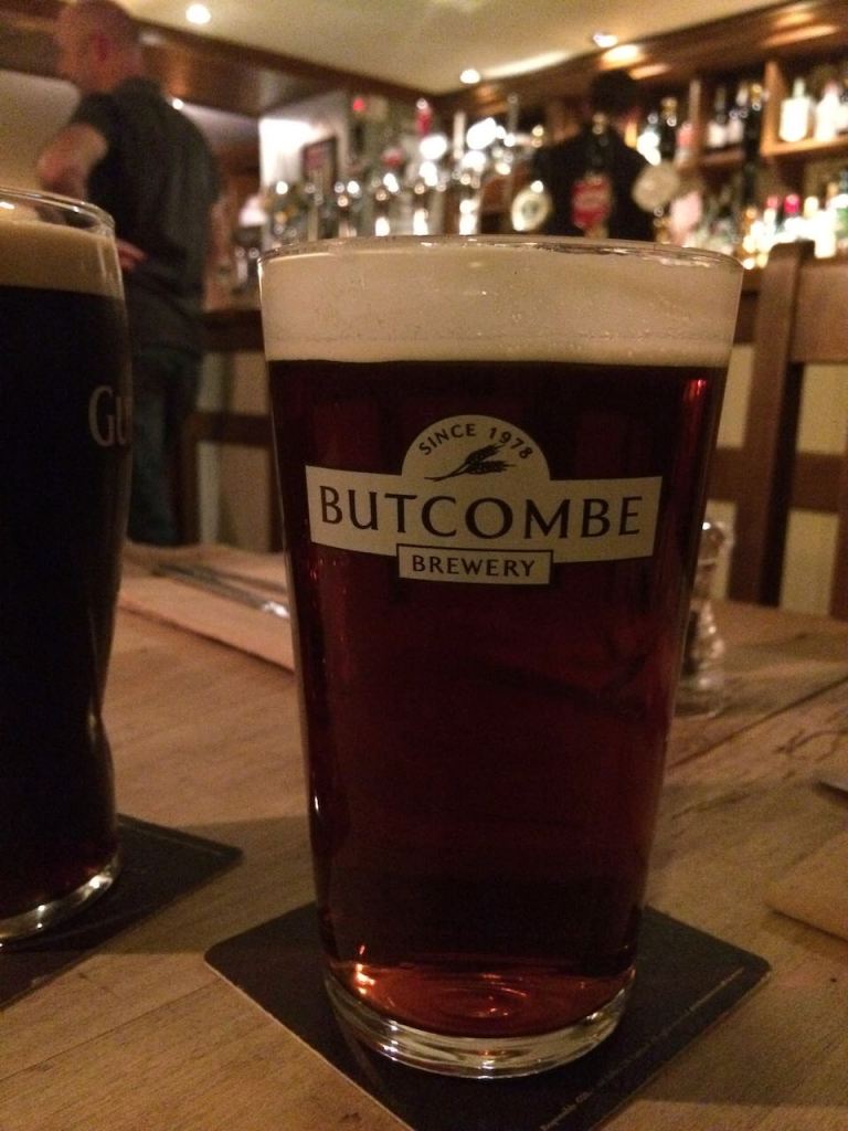 After settling in, we got back in the car to drive to the nearby village of West Stafford. The road there was extremely narrow, and there are no street lights to speak of. It could not have been any darker. The village itself was quite small with its main attraction being the pub. Coincidentally this was our destination as well. I ordered a beer called Butcombe Bitter, which was a bit of a dilemma. You see, I didn’t want a lager or anything light. It was cold out and I wanted something heartier, but I wasn’t sure how to pronounce Butcombe. Butt comb? Butt com? I asked for the bitter and the bartender understood.