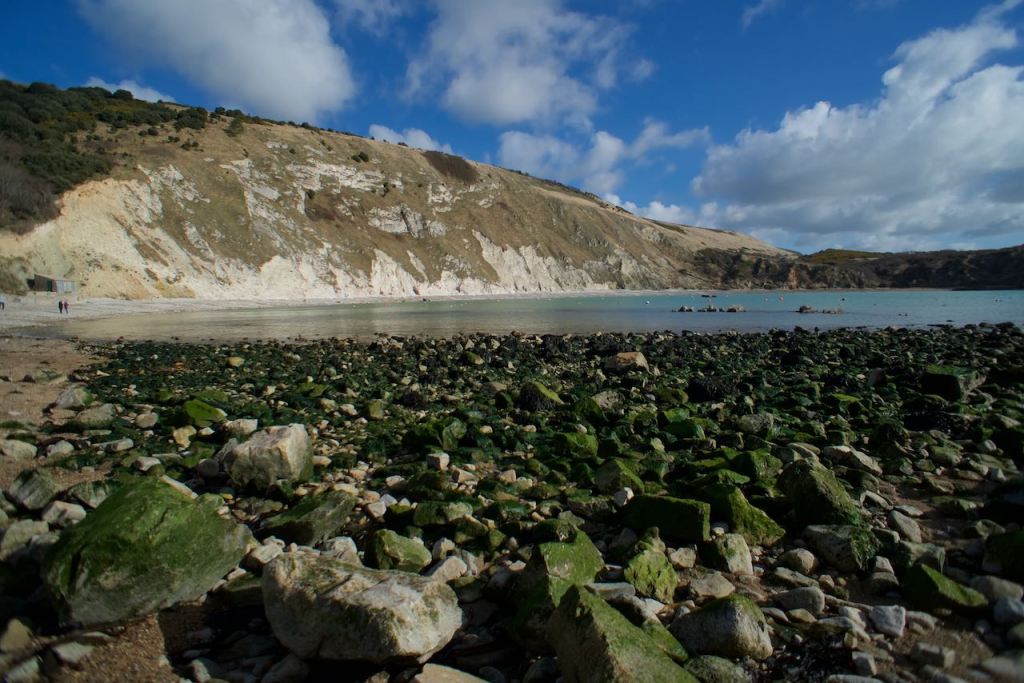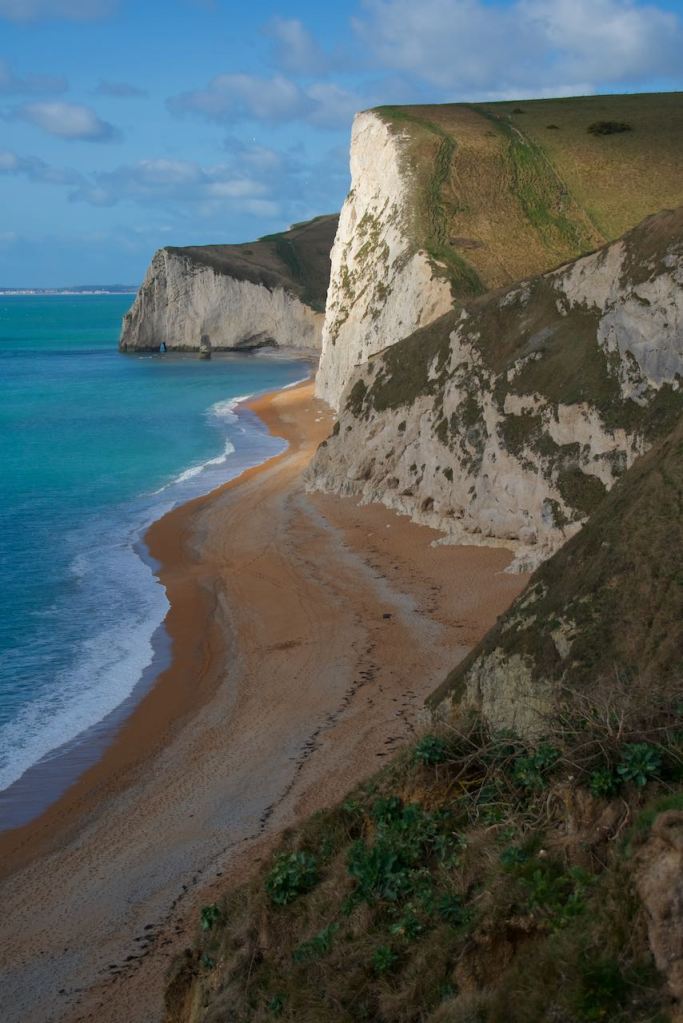 It was a short drive down to the coast, albeit a bit harrowing with the narrow roads, and driving a manual from the right side of the vehicle. Our first stop was Lulworth Cove, which you see here. I had mistakenly driven beyond the car park down a very narrow street that led to the cove, where there was no parking. My only option was to reverse all the way back up. The real sights were not the cove itself, but a natural arch on the other side of a large hill (known as Durdle Door). Someone at the visitor’s center said we could hike over it in about 45 mins, but it wasn’t hugely appealing.