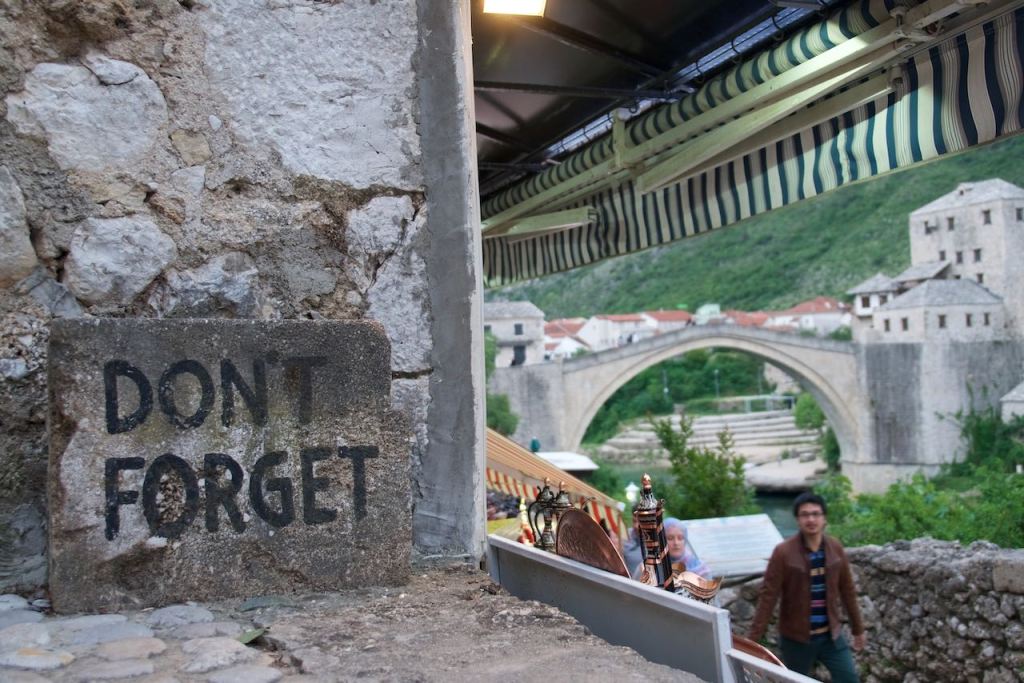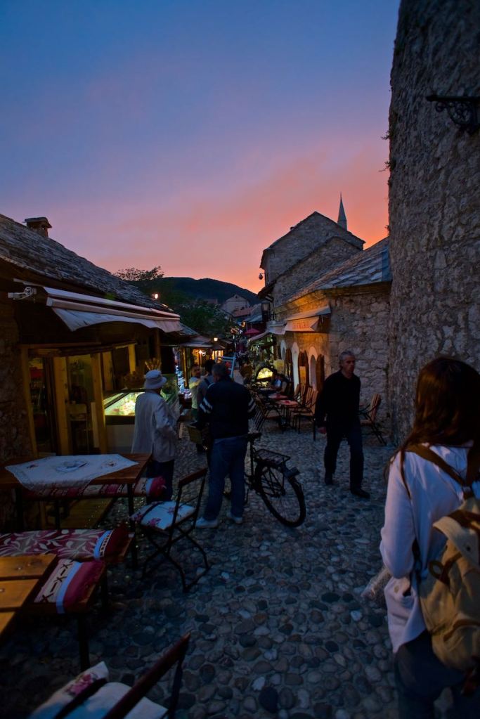 That’s a bit of a lie because the bridge itself was shelled into oblivion during the Bosnian war and was reconstructed fairly recently and looks very much like a new bridge built to look sort of old. Our B&B place has a nice room and large terrace that overlook the bridge. After getting settled we walked into the town where we had dinner. I had some sort of beef/pork/lamb hybrid thing called pljeskavica with a pita. It was a hearty meal that I washed down with an inexpensive local beer. We were also given complimentary rakia, but it was like drinking cough syrup.