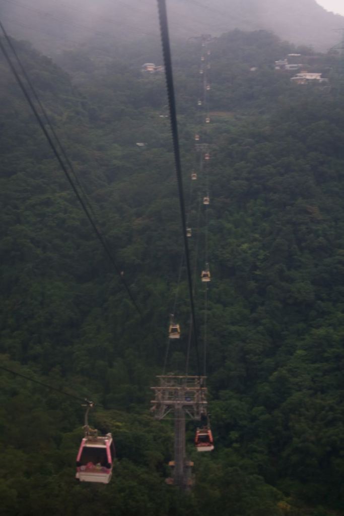 After hiking back down, we took the subway to the end of the line at another station to the southeast. A relatively recent addition to Taipei are the gondolas that climb into the surrounding hills. The total distance they travel is about 5km or so. Some have glass bottoms and the line for them was significantly longer, so Nicole and I got a regular bottom one and cut the line. We were shortly on our way. Other than an occasional wind gust, they seemed very stable and safe. The biggest issue was the chill I got as we climbed higher into the misty mountains. At the top, at Maokong station, we disembarked and I was pushing to stop at one of the tea houses for a bit of a warm up. While I was sweating during the hike an hour or so earlier, I was now quite cold in just my t-shirt. The hillsides are dotted with tea plantations, so we were close to the source. Partially as a result of the weather, this very popular attraction was not so popular today, so we got a nice seat at one of the tea houses next to a window overlooking the entire valley.