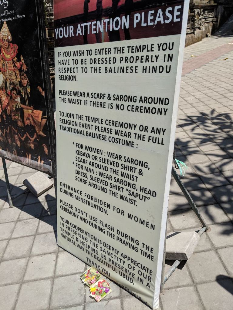 After our breakfast, we walked into town to see if we could get closer access to some of the Hindu temples. The rules were a bit daunting as you can see by this sign, so we weren’t entirely sure as to how all of this would work. Fortunately, the guy collecting money was able to provide us with some proper coverings so as to not upset anyone. The gentleman providing the scarves and such could have a career in fashion. He color coordinated our scarves with what we already had on. Nicole got red to match her stripes. I received blue that matched my t-shirt and flip flops.