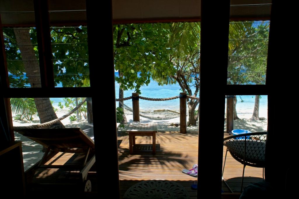 It was an interesting journey to our resort, which is on its own island about 20 minutes from the main island. We met a driver after customs who drove us for about 25 mins to the wharf and then we bounced along in the boat to Serenity Island where we received a royal welcome with musicians, a welcome party with everyone saying “Bula!” and “Welcome Home!” It’s like we were celebrities. Not bad for $145/night. We have a beachfront hut. Honestly, they all seem to be beachfront, as the island is maybe only a 1/2 mile around. Having arrived at night, we couldn’t really confirm if our view was great.