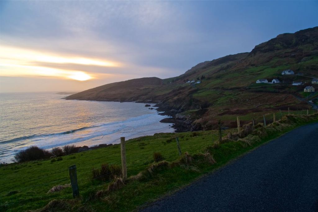 County Donegal is known as the “forgotten county” of Ireland. Tour groups don’t seem to come here, and at the same time, I think it would be impossible. The roads we took to get where we are now only have space for one car, though they are meant for two-way traffic. Luckily there wasn’t much traffic, but it does get a bit awkward when you see an oncoming car and there’s a cliff to your left and a giant stone hedge to your right. There is no such thing as a shoulder. For a bus it would be impossible. In our tiny Toyota Aygo hatchback, we still barely had the turning radius to make it around some of the sharp turns, so I can’t envision any buses coming through here any time soon. As the sun continued to go down, I recalled seeing a good viewpoint a few kilometers back up the road that had a good view overlooking the peninsula. Now, it didn’t have a formal viewpoint as it was on the aforementioned road, but there was a slightly worn area in the grass to one side of the road that was just wide enough to be off the road. We “parked” there. From this spot, I set my little tripod up on top of our car and was able to take some pictures of the fantastic landscape laid out before us. Perhaps the most remarkable part about it all was the total lack of other tourists. We continued down the road a short ways until we got to a place called Muckros Head, where people would normally hike, climb, or have a picnic, but it was deserted. From there we watched the waves and sea spray crash into the nearby peninsula. It was an enjoyable reward for all of the stressful driving.