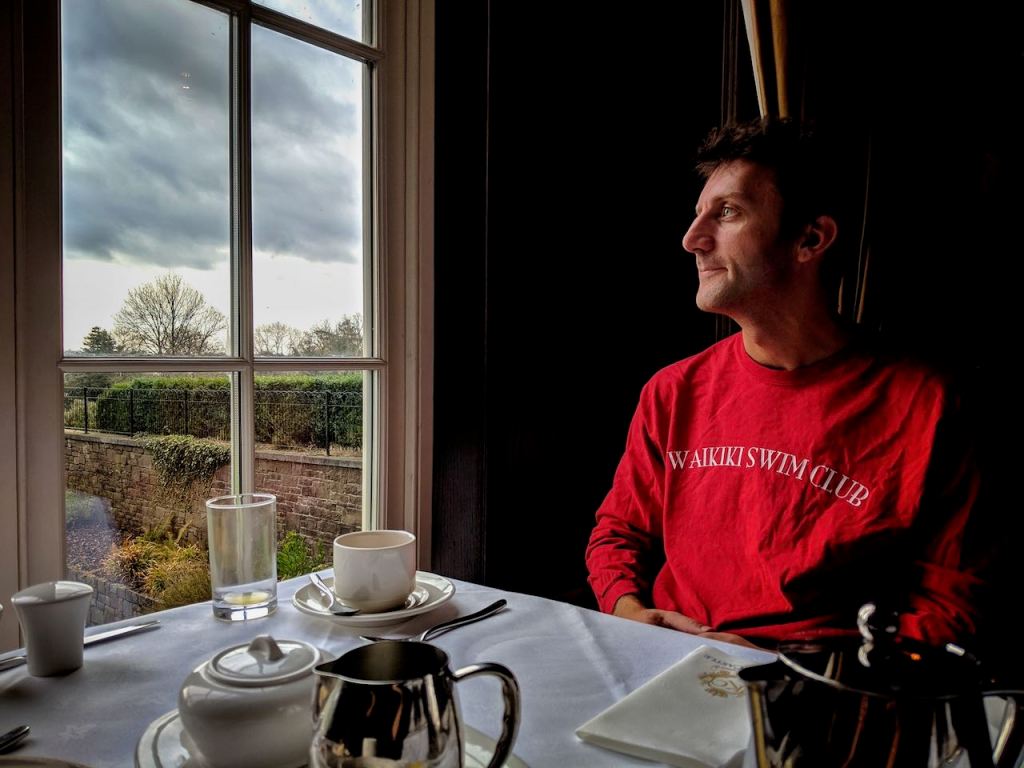 Nicole and I conferred and agreed that we didn’t really have anything we wanted to see or do in Dublin’s city center, so we decided to spend our time in Howth, a coastal community that appears to be very “well-heeled,” as the expression goes. We are staying in a B&B that seems like something out of Pride & Prejudice. The ceilings are very high, and the decorations are certainly from a different era (though in the case of our bathroom, that era is the 1970s). Our B&B is close to a coastal cliff walk, which loops around the peninsula. After we got settled into our room, we headed out on the cliff walk. Initially it was fine, but we rounded a corner and the wind was straight into our faces at perhaps 40mph. We braved it for a spell, but then agreed that it wasn’t worth continuing into the gale. We returned to the B&B to debate our next plan of action and decided upon tea and scones to warm up. I found a tea room in town a few minutes away and we parked on the side of the street nearby. What would have been two parking spots in the United States was somehow five here outside Dublin with one gentleman somehow creating a spot behind mine for his tiny hatchback.