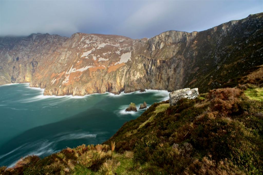 We had purchased some scones and bananas last night for our breakfast. We ate those along with a pot of tea and headed out for the day. It took us about 20 minutes of driving on some interesting roads before we got to the Slieve League. After giving way to a few sheep, and having to open and close a gate behind us (to prevent the sheep from wandering off) we made it to a lookout point. The wind nearly blew us over when we got out of the car. It died down a little bit when it got blocked by a hill around the corner, but it was still quite strong. The Slieve League are the highest sea cliffs in Europe (and more than 3x the height of the Cliffs of Moher thank you very much). There was a viewpoint not far from the carpark and a trail continued onward from there up some stone steps that blended well into the surrounding landscape. We took this trail to another viewpoint, and then decided to turn around due to the very strong winds. The trail gradually got more narrow and we did not want to blow over the side. I tried to do a few longer exposure shots that required a tripod, but that was pretty much a bust since the wind was so strong and the camera moved too much.