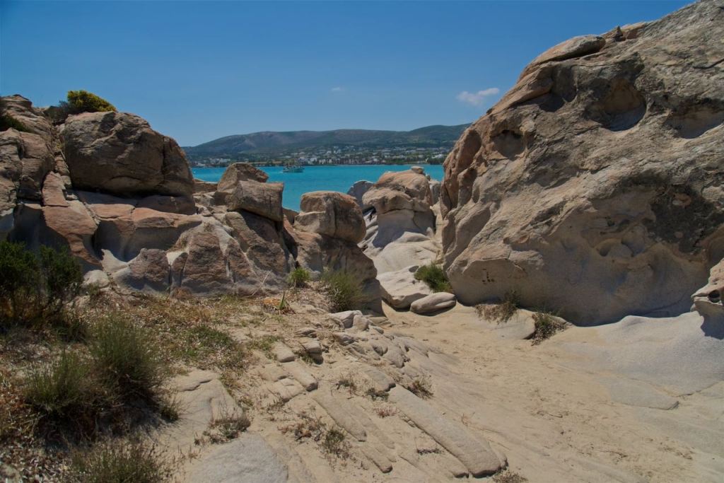 We are almost adjusted to the 10 hour time change from Los Angeles, and woke up at a very acceptable 9:15am. We had a hearty breakfast and then drove to Kolymbithres beach, a short 10-15 min drive away. It is perhaps the most popular/famous beach in Paros, but it wasn’t overly crowded. There were some umbrellas and chairs set up, but most were unoccupied. It was no Jersey Shore (and a lot nicer). What made us want to go to the beach were the interesting rock formations that protrude all along the water and look more like some scifi movie set than a beach on Greece. The water was very clear and Caribbean-like, though as we can both attest to, it was a bit chilly still.