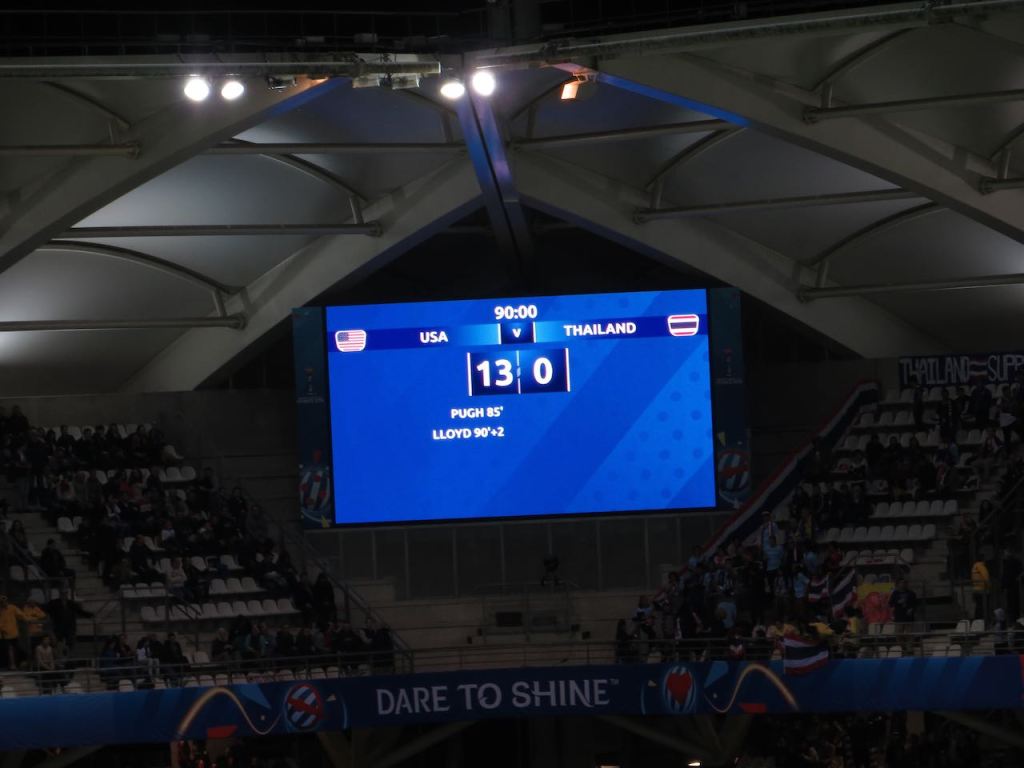 I don’t think anyone expected Thailand to get a win over the U.S. and that includes the Thai National Team themselves. They were simply proud to be there for the second time. Of course they were hoping to see a lower point deficit, but it’s worth noting that veterans such as Alex Morgan and Carli Lloyd sought out their opponents at the end of the game and gave them words of encouragement. This ultimately ended up in an amusing twitter exchange between Lloyd and the Thai goalie who seemed almost star struck that she had been approached by one of the greatest players to play the game. Point being the Thais were not offended by the 13-0 deficit, or the celebrations. Upset and disappointed? Yes. Offended? No.