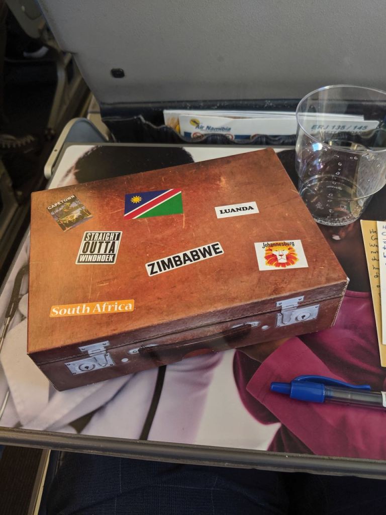 We endured about 40 minutes in the check-in line before going through security and ended up boarding the flight about 45 minutes ahead of schedule. We spent the next hour and a half on board an Embraer 135 regional jet over to Windhoek, Namibia. I enjoyed my snack box design which was made to look like an old-timey suitcase with various destination stickers on it. Once we arrived in Windhoek, it was a fairly easy immigration line, and then we went to get our rental car. The lady behind the counter said, “We have no cars! We sent you an email two weeks ago! Didn’t you get the email?” I found that a bit odd, so Nicole and I were questioning her a bit, but she was adamant that an email was sent. After about 30 seconds of back and forth, she admitted she was kidding. The African sense of humor is a curious creature. Anyway, apparently not many people are renting cars because we were the only people from our flight at any counter, and when we went to the parking lot, another employee was waiting at our car to show us all the features which was quite exhaustive. We will be driving a Renault Duster, a 4-wheel drive, 6-speed, diesel-fueled small SUV. We had a roughly 25 minute drive to our hotel in Windhoek since the airport is out in the middle of nowhere. Despite arriving early, the sun had already set, so we had to drive in the dark. And it was DARK. There were absolutely no buildings or anything to give off even the tiniest bit of light until we got within half a mile of our hotel.