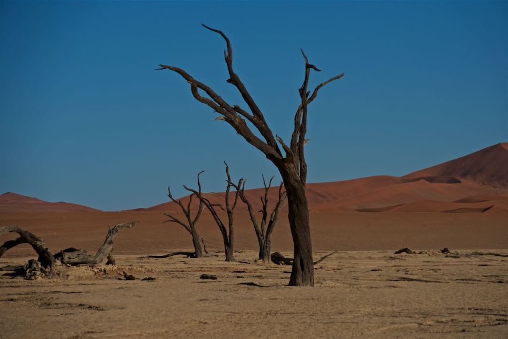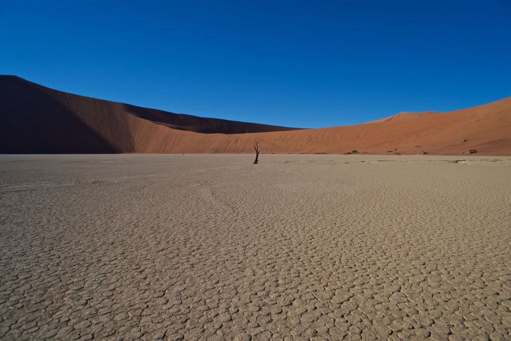 Lots of buses and other vehicles had pulled over at some other sites along the way either to climb up sand dunes or stop and take pictures. This was a good sign to us because we were able to keep pressing onward and ahead of them. The road eventually ended at what is known as the 2WD lot. From there, we hopped on a truck to forge the rest of the way on a track of loose sand. From a technical standpoint, we could have attempted the trail in our vehicle since it is 4WD, but I didn’t really think the Duster could handle it. After a few more kilometers, we were dropped off at what I suppose you could call the trailhead, except there wasn’t a clearly defined trail. Since it was early, there weren’t really people to follow. We saw one group heading toward a large dune, and we figured there had to be a more efficient way of getting there than by filling our shoes with 10 lbs of sand. I used my phone to help guide us toward our destination. We traversed a couple of smaller dunes, and after about ten minutes or so, crested over one final dune to catch our first glimpses of Deadvlei.