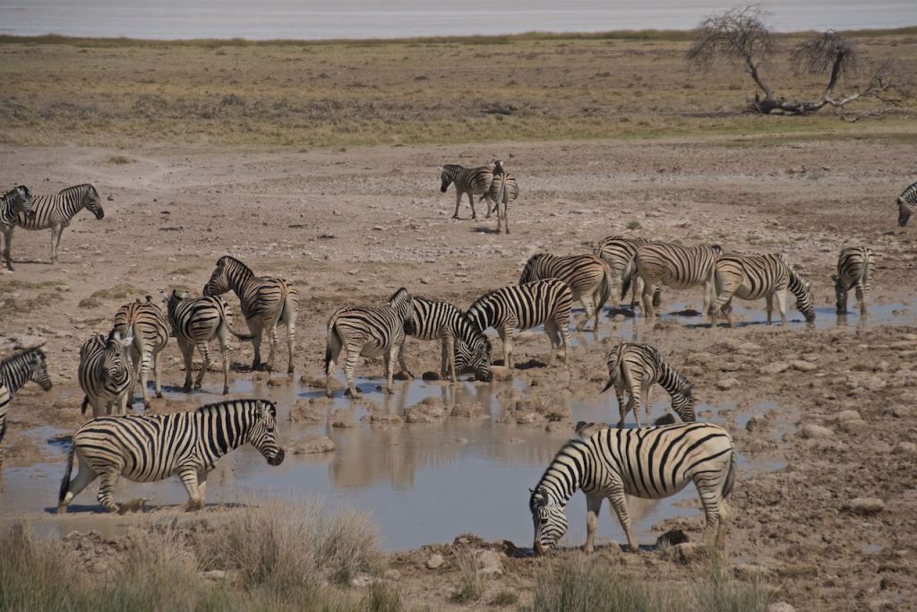 We sat there for a while taking it all in when Nicole thought she saw something on the horizon. She used her binoculars and discovered they were elephants. We thought perhaps they might make their way to the water hole, and some 25 minutes later, they finally arrived, causing all the other animals to briefly scatter while they played in the mud. There were eight elephants in total, and it appeared to be two separate families that seemed to travel together. Eventually they headed off somewhere else, and the other animals closed back in on the water hole. After all this, we made a brief stop at the Okaukuejo camp, which is kind of like the epicenter for everything in the park with a gas station, convenience store, and my destination — the restroom. We got back in the car and did some exploring to the west this time, encountering a total of three vehicles over the course of the next two hours or so. The landscape in this direction was even more barren or dried out. Many of these water holes had dried up. The habitat looked more like where the hyenas hang out in the Lion King. In fact, we saw a few dried carcasses alongside the road. As we continued, we saw a small herd of zebras walking along the road, and we found ourselves basically migrating along with them slowly. Sometimes we’d stop to take a picture, and they would often stop too, sizing us up and wondering what our next move would be. We encountered a small herd of oryx just down the road from them, and much further along even saw a few giraffes. The lighting on them, however, was poor, so we were glad we had seen them in Chobe back in Botswana.