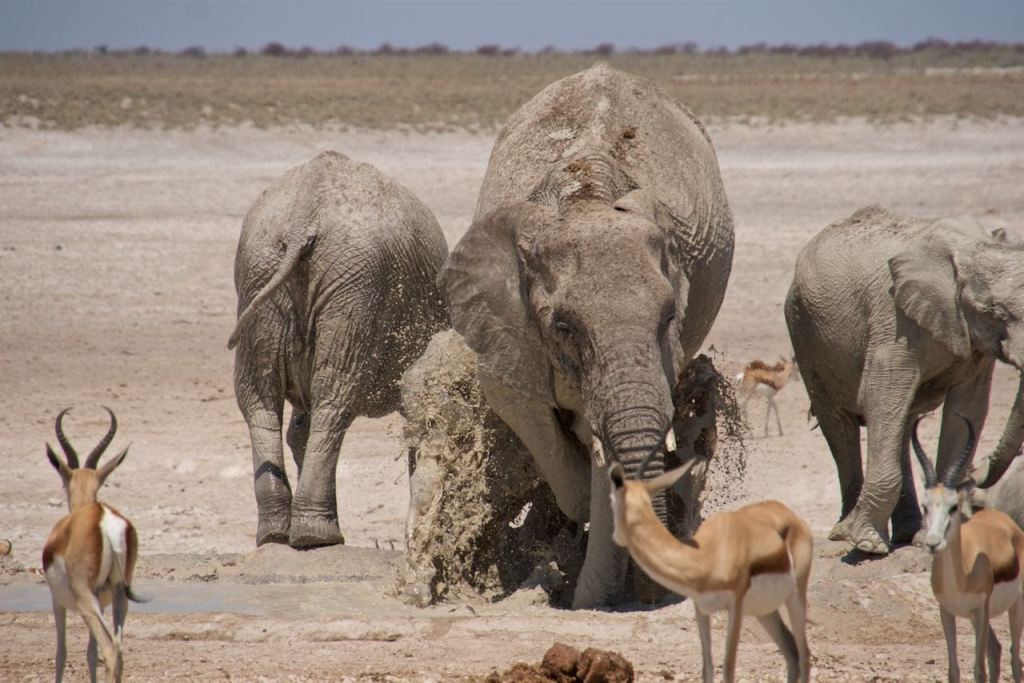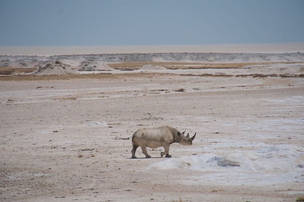 I had pulled over briefly to watch a few ostrich crossing the road, and then witnessed a safari truck go flying by at top speed along the bumpy road. They turned into the next water hole, and we followed shortly thereafter. Nicole and I speculated that there was some sort of sighting at that water hole, but at first glance it looked the same as the others. But then we saw it lumbering slowly in front of us – the rare black rhino. It didn’t quite make it to the water hole because it just kind of fell over, rolled around for a second or two, and then lay there in the mud, just chilling. It stayed that way for a while. After about 15-20 minutes though, a small group of elephants rolled up to the water hole and the rhino took that as its cue to leave. It seems that when the elephants show up, all the other animals kind of scatter. Eventually so did we. We continued west and eventually got all the way back to the large manmade pan, where there was just one car parked now — a far cry from the situation earlier in the day. We thought perhaps the tour groups and other guided tours were now getting lunch, while we, fueled just by granola bars and some crackers, had a panoramic view of numerous species sharing the large water hole.