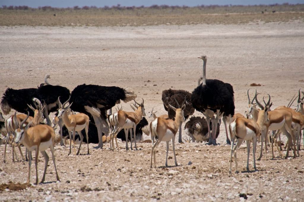 Enroute we saw a few elephants, but then again, so did a bunch of other vehicles, and we were blocked in until one of them finally moved. So far, our experience in Etosha wasn’t great. However, the further we drove, the fewer vehicles we encountered. By the time we reached Charitsaub water hole, there was only one car parked at the viewpoint, but probably 50 zebras and springbok taking turns drinking water. We lingered there for a while, as it was our first zebra sighting, and we probably overdid it on pictures of the old black-and white. After a while we continued east to other neighboring water holes, where we saw more zebra herds, bok, oryx, wildebeest, and an occasional ostrich. Eventually we reached a point, where I decided would be as far east as we should go, so we doubled back to the west, hitting some of the water holes that we had skipped over earlier in the day.