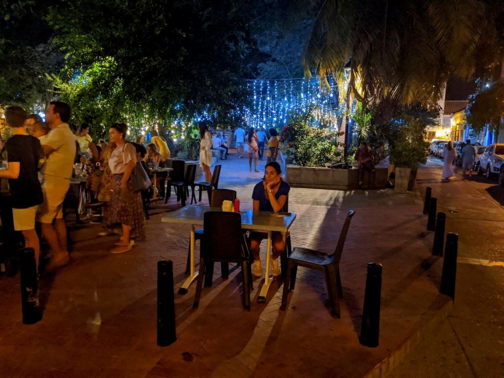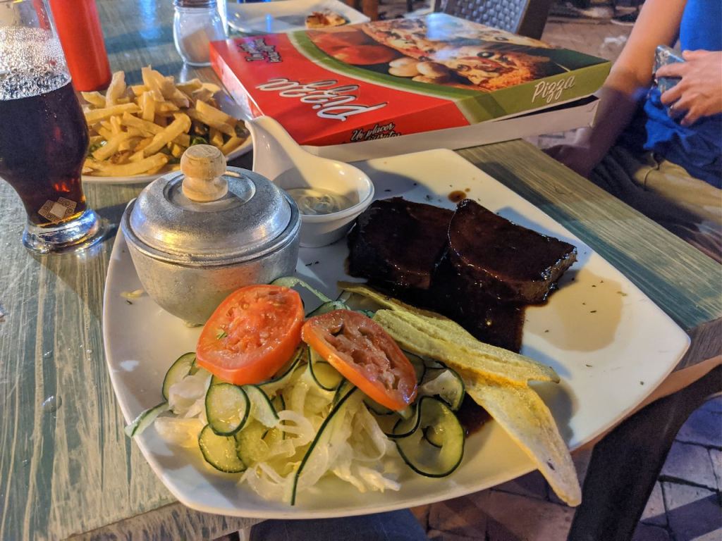 I had made a dinner reservation for 630pm (when most restaurants just start opening for the night). I thought perhaps a reservation was needed since outdoor space is often limited, but it turns out it was most definitely not required. We were the first people there, and watched them physically open the restaurant and put out the signs and menus. I had picked this place because I wanted to try a local dish called Posta Negra Cartagena. It’s basically steak cooked in a sauce made out of Worcestershire sauce and Coca Cola amongst other things, so it’s a kind of tangy/sweet flavor served with plantains, and coconut rice. Unfortunately, the restaurant I had reserved told us that they were out. It had been a frustrating evening of running into people and nearly getting hit by cars, so we were in a bad place when we heard this news.