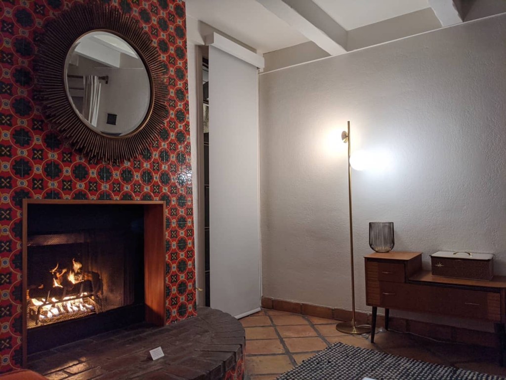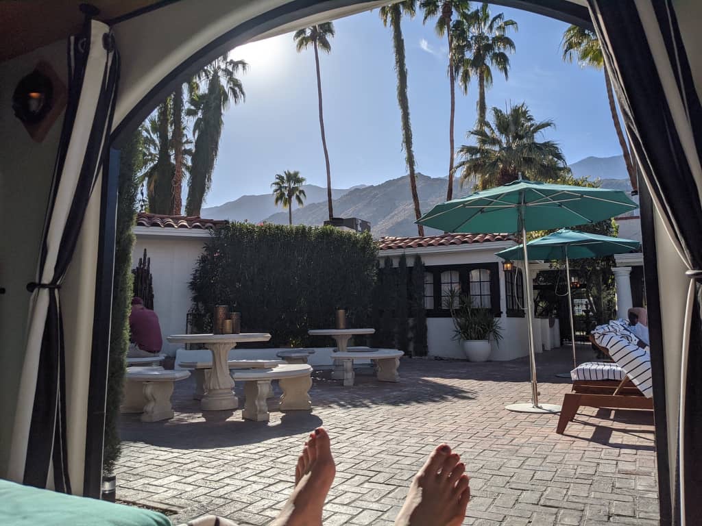 After the sun set behind the mountains, we reconvened in our room, which truly does seem more like someone’s house than a hotel room. Usually when booking on HotelTonight, we get a room next to the lobby and elevator, or some windowless closet next to the ice machine. Not so this time, and after all of our nonrev woes, it seemed like we deserved it. Since there are numerous outdoor areas, we decided to get takeout and bring it back to our place to eat. We picked up some pizzas downtown and ate them outside of our room. One of the staff came in to light our fireplace, I put on a Spotify playlist for some 1950s easy listening, and we relaxed on the bright orange sofa (or davenport as my Grandma used to say). Palm Springs may be close to Los Angeles, but I think we just needed to get out.