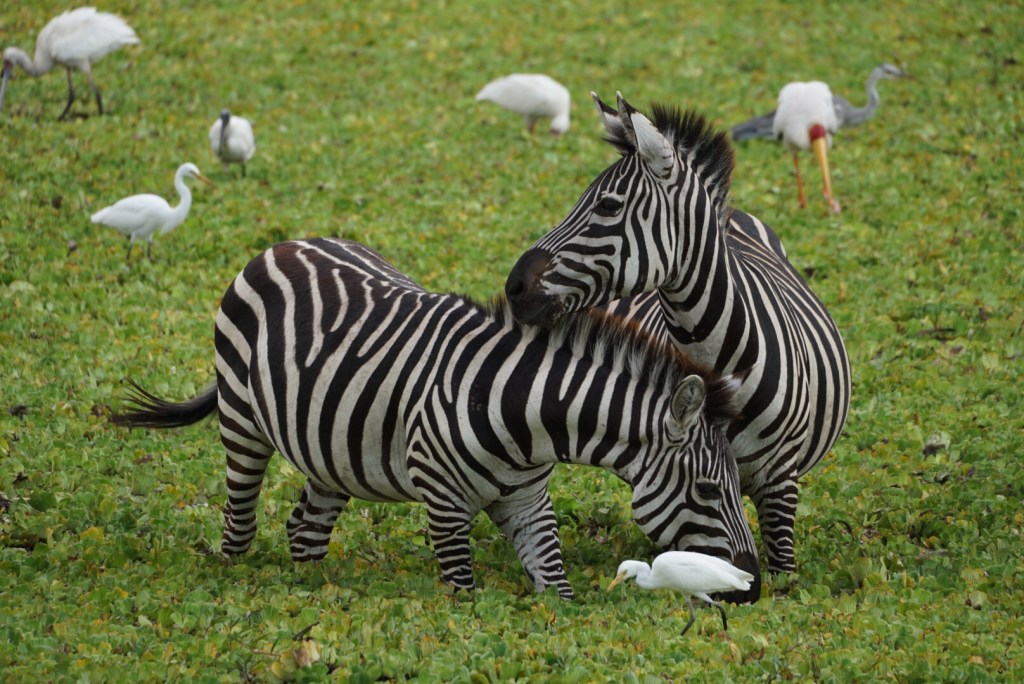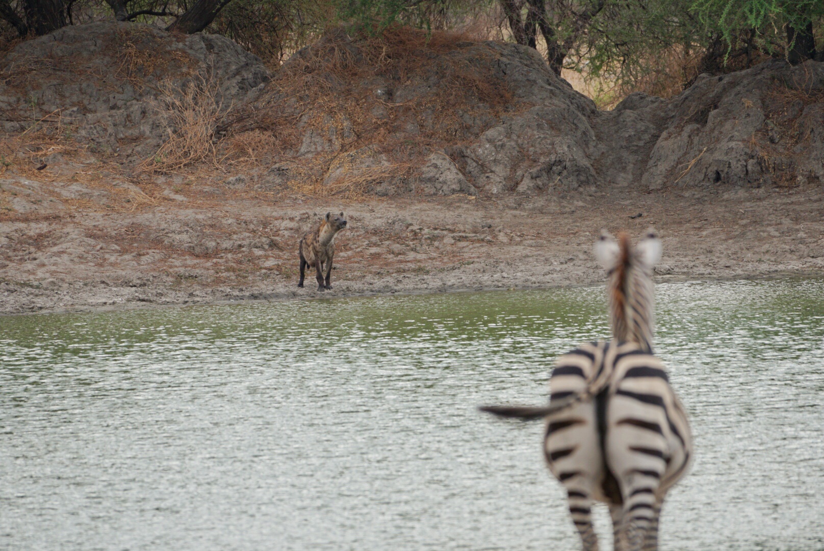 As we ventured further into the afternoon, we saw some lions in the distance resting in the shade of a tree. We also were intimately introduced to the Tsetse Fly. Prior to even packing, we were familiar with this pest and read not to wear dark colors, but also not to wear very bright colors. Basically, one is just supposed to wear very neutral colors. While they don’t carry disease, they are really annoying. Their bite is quite jabbing, followed by some itching and a welt. What’s their game? Like what’s in it for them? At one point it got so bad, we had to close the roof. They’re very aggressive and tenacious. Once the tsetse flies started attacking us, the excitement of the game drive kind of waned. On our way toward the park exit, we did, however, see a hyena on the other side of a small lake. Being in the tsetse-infested park gave it no reason to laugh, though.