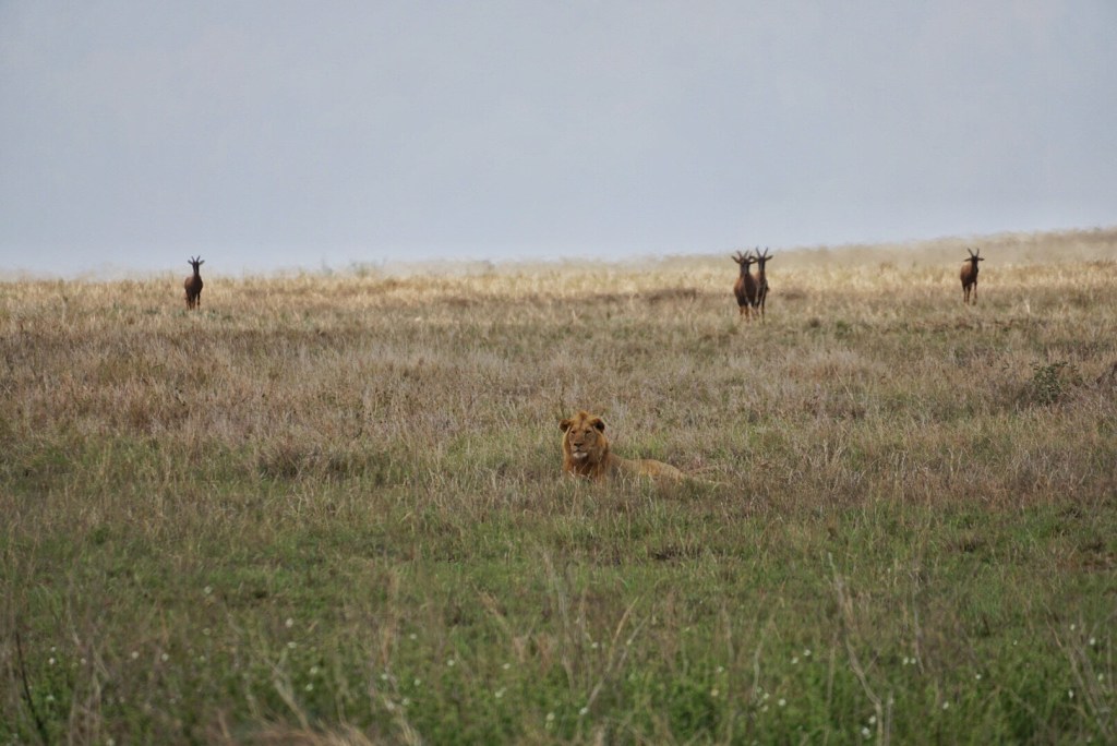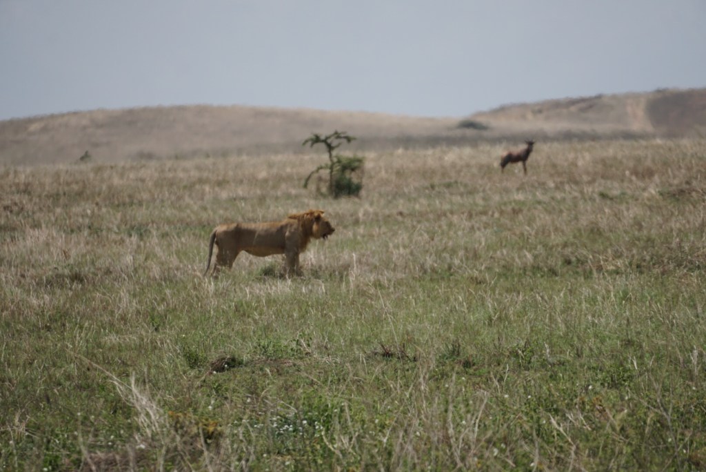 While our main objective was to get to our tented camp area, we had to pass through a large swath of the Serengeti to get there, so the afternoon became another game drive. We spent most of the day on the eastern side of the park. The Serengeti is quite vast, so unlike Tarangire or even the Ngorongoro Crater, the animal sightings were not as frequent since the animals are not confined to as small an area. While the animals were spread out, so were the safari trucks, which was kind of nice. We rarely encountered them, but if we saw one stopped, it was almost like a guarantee that a lion was nearby. We did see a male lying in the tall grass. We decided to use that spot to eat our packed lunches as we waited to see if he ever stood up. Eventually it did happen, and I scared Nicole because I threw my food down and yelled, “It’s on the move!” Its movement was brief, however, since it was merely getting up to look around and then lay back down for what I can only assume was the rest of the day.
