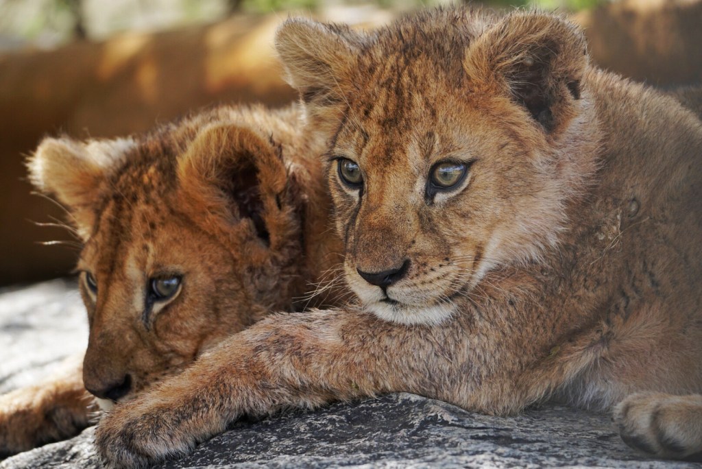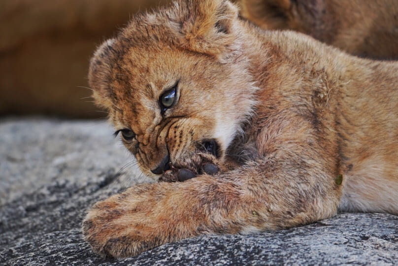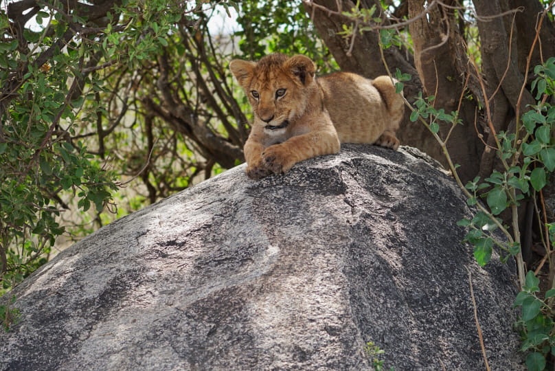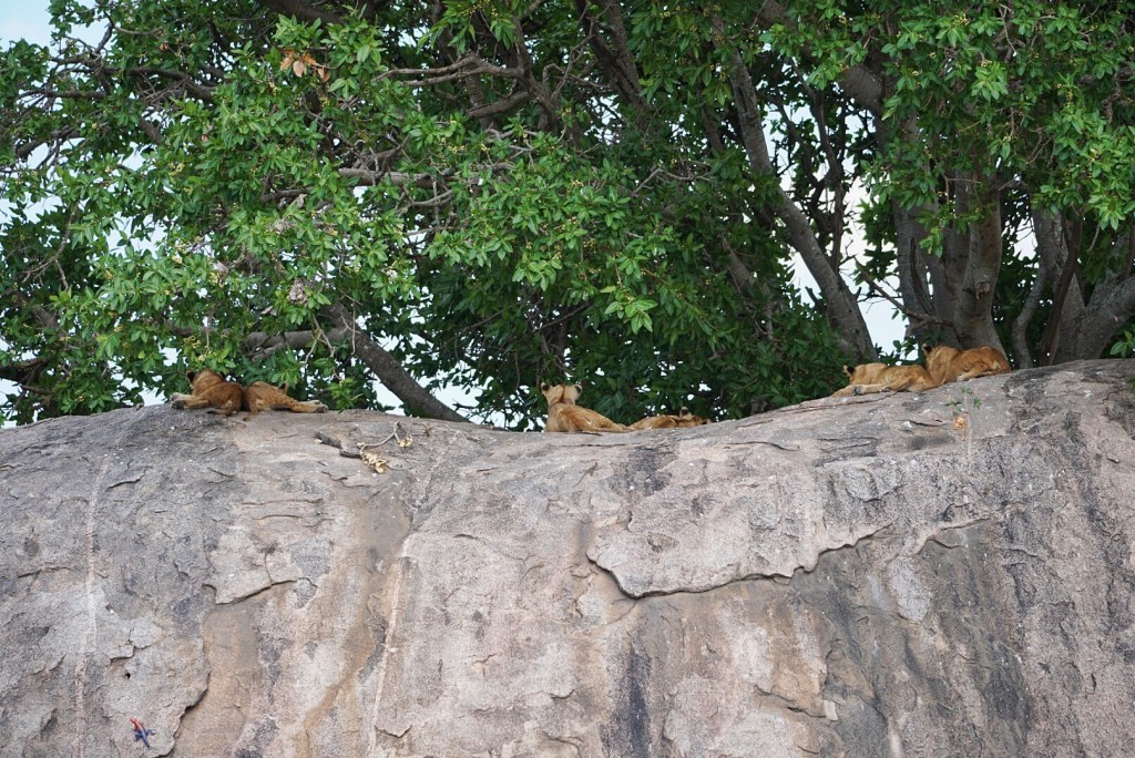 After that, it seemed like we were driving for some time without any major sightings. We eventually found ourselves amongst some rock formations that looked very unique set against the otherwise flat landscape. On the top of one, we saw several lion cubs showing us their butts.