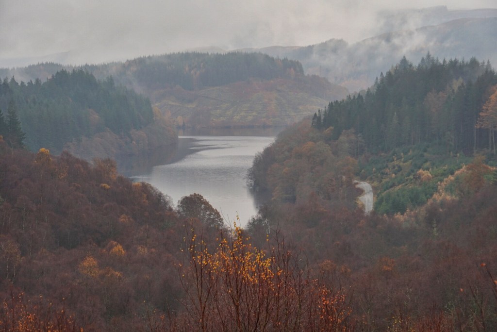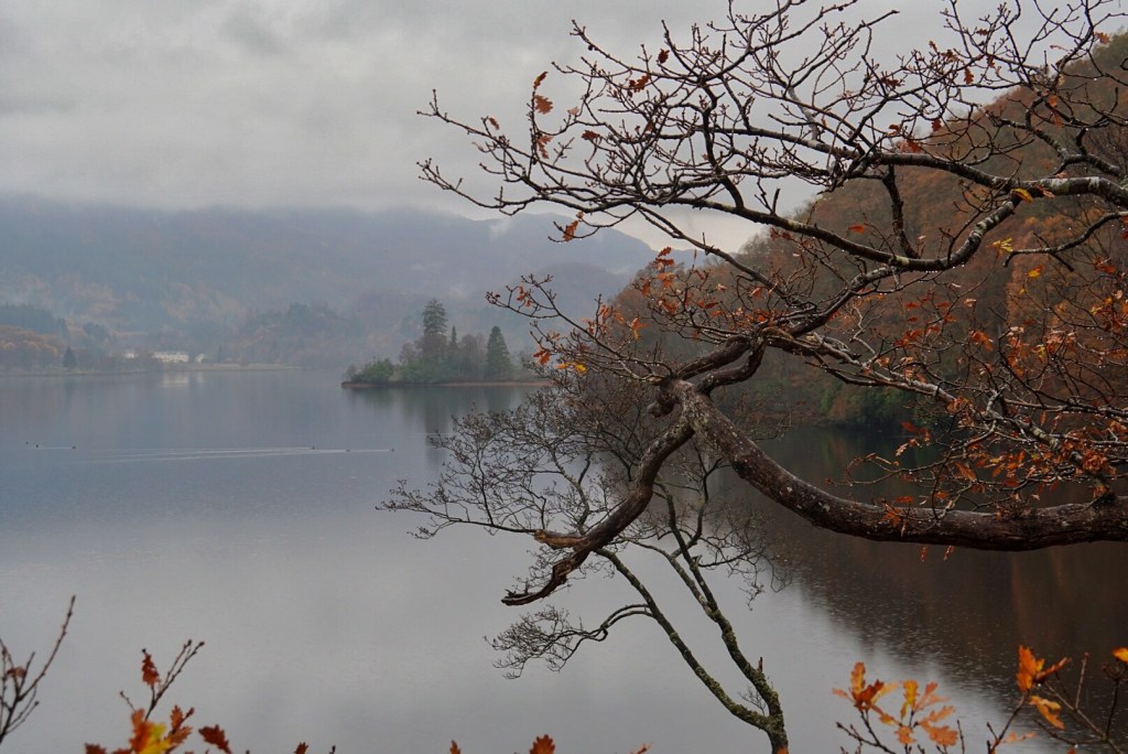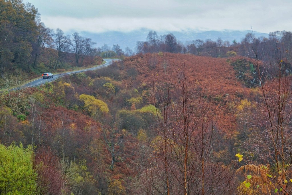 We ended up at a place called Loch Ard. Fortunately, there wasn’t a lot of traffic, so we could take a nice leisurely pace around the very curvy road. Despite the persistent drizzle, we saw a fair number of cyclists and hikers which we thought was an interesting choice given the weather. I suppose if the weather is so variable and grey on a pretty regular basis, one needs to get out regardless the circumstances.