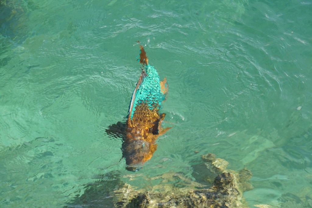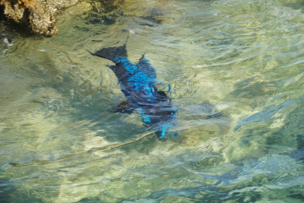 In the water, we noticed some very brightly colored fish — some an aquamarine hue while others were an intense royal blue. They had the same shape, so perhaps they are the same species? Emily would know.