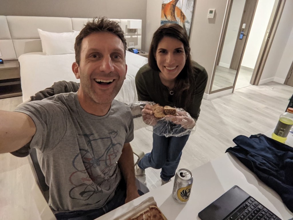 All of the restaurants were closed when we arrived, so we ended up making a Valentine’s Day dinner out of snacks purchased in the market in our hotel lobby. I offered to get Nicole some chocolates from the market, but she ended up paying for them herself because she gets 12x points at Hilton properties with her card. She’s a Hilton Honors Gold member you know.