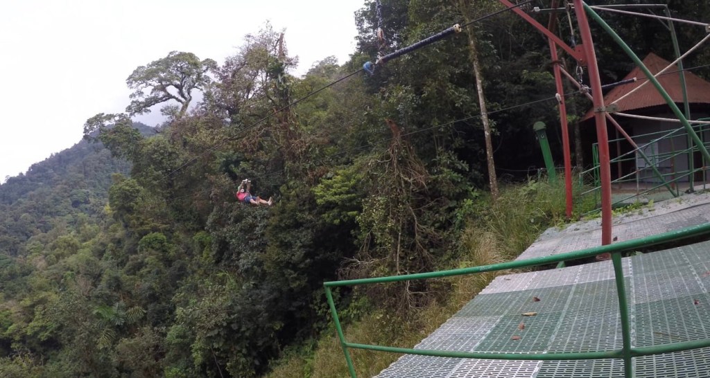 Upon our return from the hike, we grabbed a quick lunch before getting in the car to drive off into Arenal National Park. This is where we got outfitted in our zipline gear and ultimately boarded an eight minute sky tram/gondola that took us above the canopy. As we ascended, the temperature dropped and we encountered a temporary downpour that didn’t affect us since the tram was covered. By the time we reached the top, the rain stopped.
