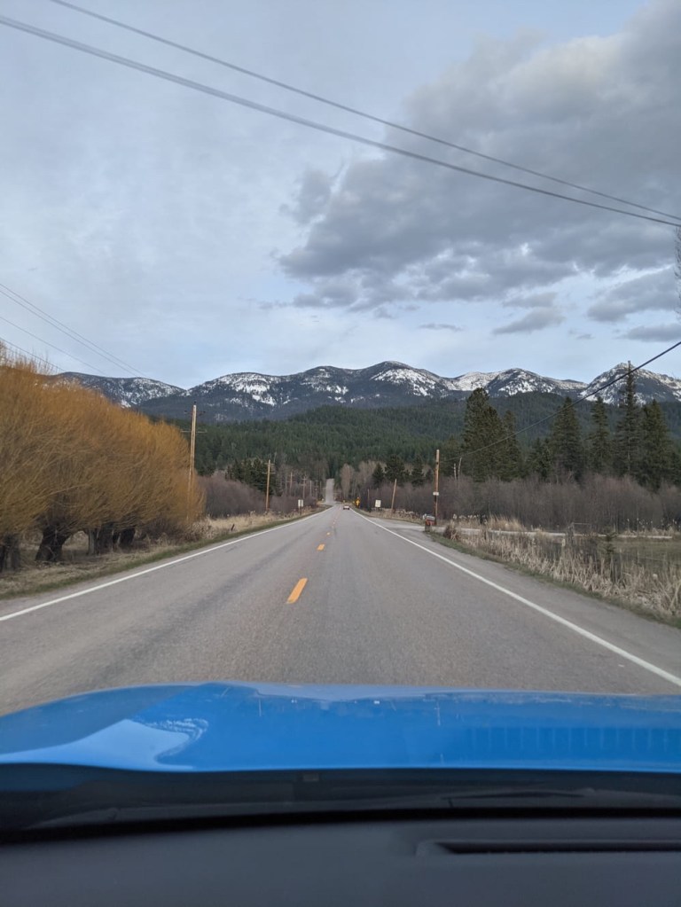 Perhaps later I will provide you, dear reader, of a full body shot of our rental car, but for now here’s a tease of the hood. From Missoula, we had a two and a half hour drive ahead of us. It went by fairly quickly with good conversation and good scenery. In the summer when tourism really explodes, one can land at the much closer Kalispell/Glacier Park airport. I myself have done a fair number of these direct flights from Los Angeles. It is, however, a seasonal route, and direct flights from LA to Missoula didn’t even begin until . . .today.