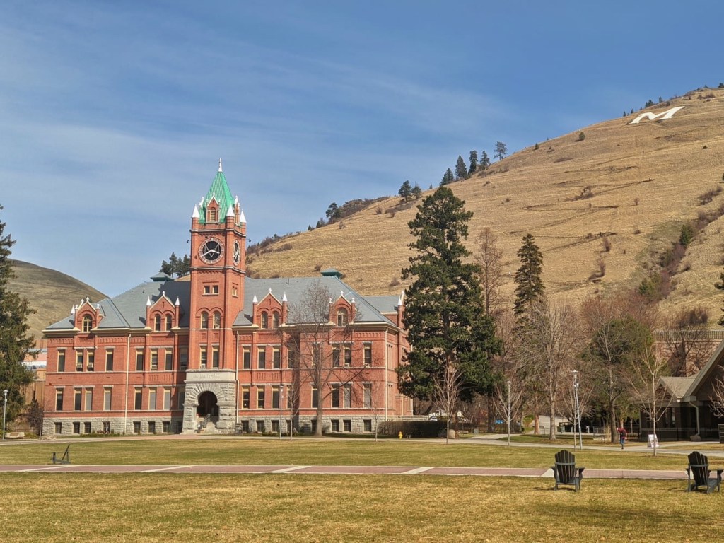We moseyed back to the car before getting back on the road toward Missoula. We initially drove an additional 30 mins out of our way in hopes of seeing a ghost town, but the road to get to it was inexplicably closed, so that was that. We ended up parking at the University of Montana campus in Missoula to regroup and kill time. We sat in a parking lot next to a dorm fashioning a lunch out of leftover muffins, granola bars, and pieces of fudge. We have given up on trying to get food in this state. Though, things may be a little different in Missoula. We walked a bit around the campus to discover that people were wearing masks, so I guess the pandemic is back on. Shoots.