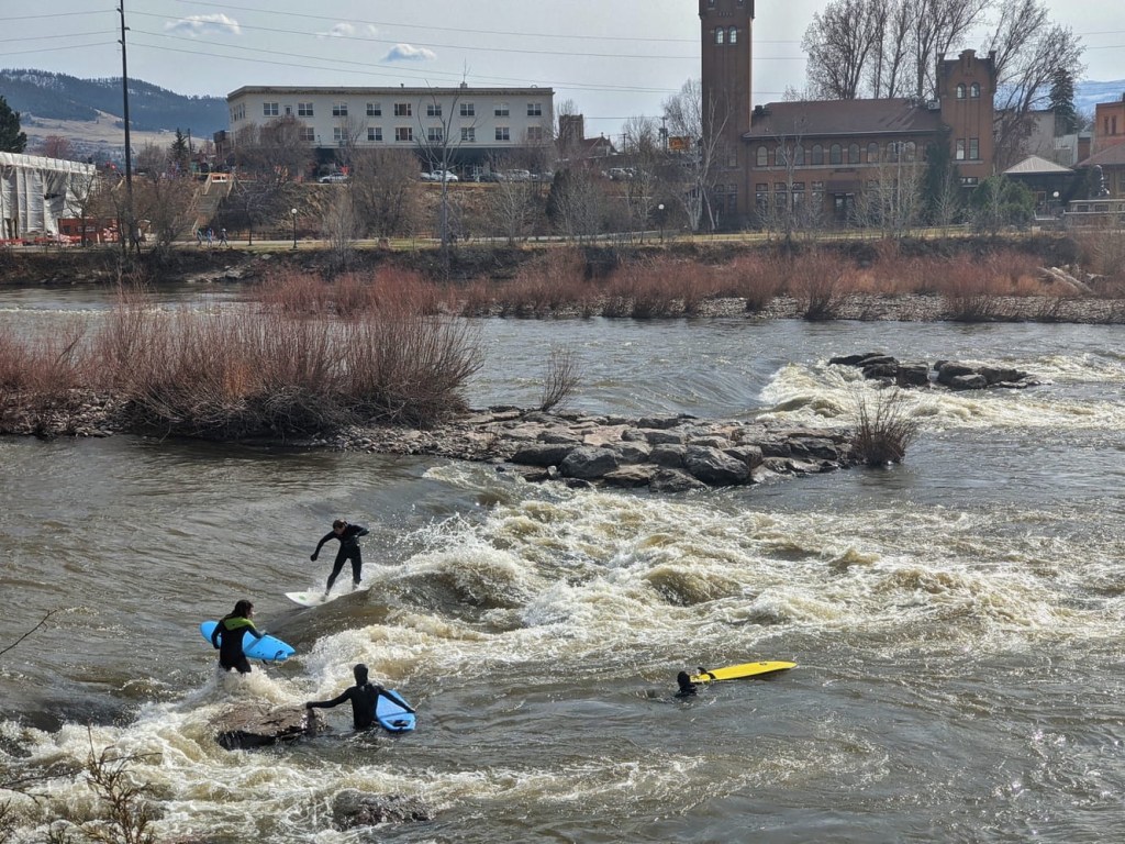 We parked next to a park by the river, and chanced upon these river surfers. We haven’t seen such a spectacle since Munich. I’m not sure which river appeared cleaner. They both had a similar hue of brown. From there we drove to the airport to drop off our rental car and head through security. It was a small airport, so none of this took very long. After killing another hour, we were boarding the plane back to LA. We got a warm chocolate chip cookie before our descent, which was a nice treat for these weary travelers. We both had a few days before work to relax and reflect on our brief sojourn in Montana.
