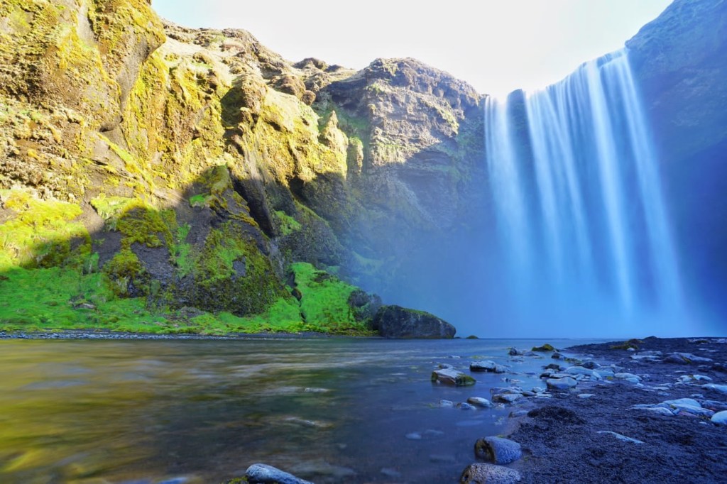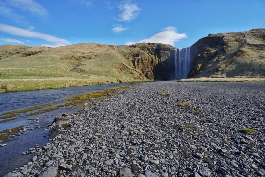 In any event, it was quite windy for our Dacia Duster 4×4 on the open road. It was almost a three hour drive to the Hotel Kria on Iceland’s south coast. The landscape gradually changed from volcanic drab to dramatic cliffs, lush greens, glacial mountains, and striking waterfalls. Many could be seen just off the road. Eventually I saw one so big in the distance, I had to pull off. This turned out to be Skógafoss, one of the more famous waterfalls in Iceland. Other than one other small group of visitors, we were the only people present.
