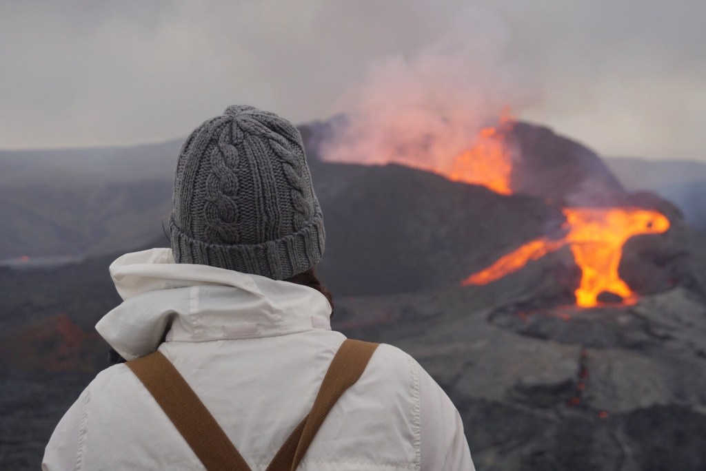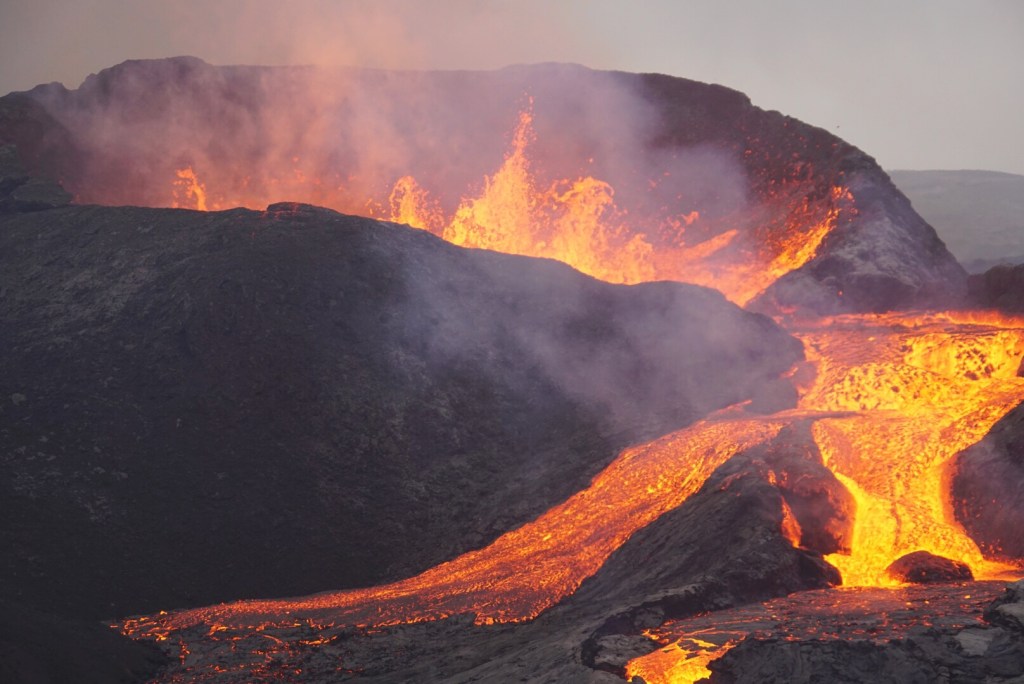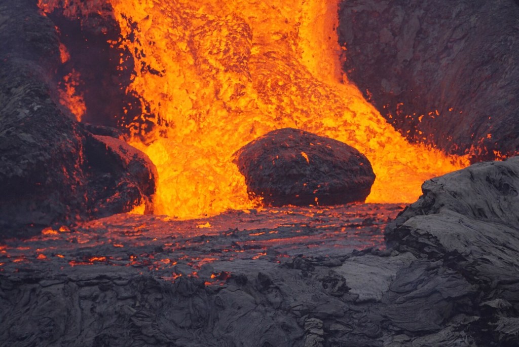 The wind was a formidable force, especially once we finally reached the summit. It was, however, blowing at our backs at this point, which is key so as to blow the poisonous fumes away from us. The current eruption Geldingadalir on the Reykjavik peninsula is fairly frequent, with lava flows occurring every five minutes or more. When we first arrived, it was just a glowing orange/red valley in front of us. This in itself would have been impressive, but that was nothing compared to what was coming.