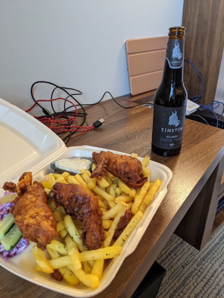 The restaurant at the Courtyard Marriott by the airport was so packed, we ended up getting food delivered to our room. I enjoyed some fish-and-chips with an Einstok porter. While this is technically a beer that we can get at the market across the street back home, we welcomed the “local” ale as reward for our efforts of the day. Both of our covid tests came back negative, so we are good for phase two of our journey — which involves Jordan? We think? Traveling is complicated these days.