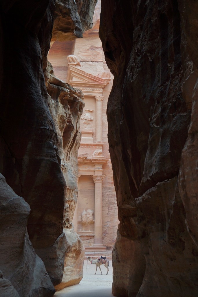 There was a lot more walking than either of us expected. I knew it was a while to get through the siq (the slot canyon-like pathway leading to the treasury), but it’s a significant walk just to get to the siq itself. The siq eventually opens up to a dramatic vista of the Treasury. There were two or three other tourists there and about 15 Bedouin hawkers trying to offer us camel rides or show us a secret viewpoint or any other number of things. They were quite persistent and it kind of killed the vibe while we were just trying to take it all in.