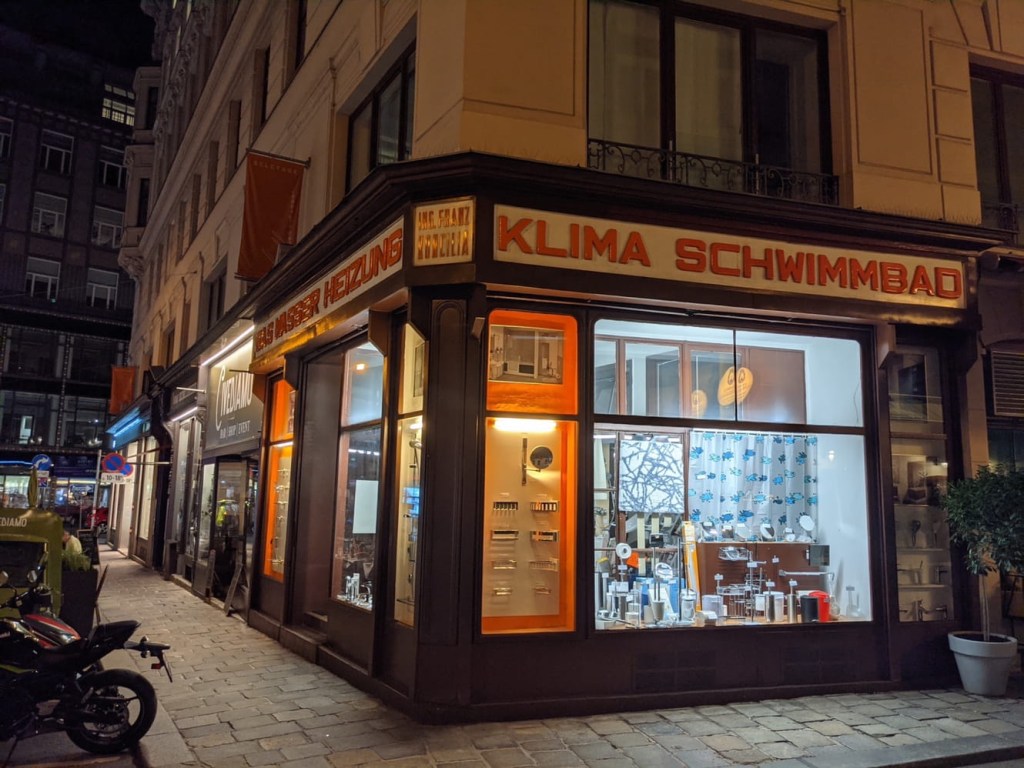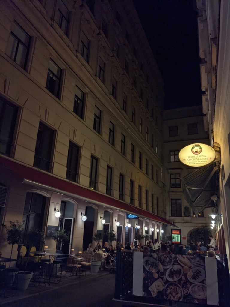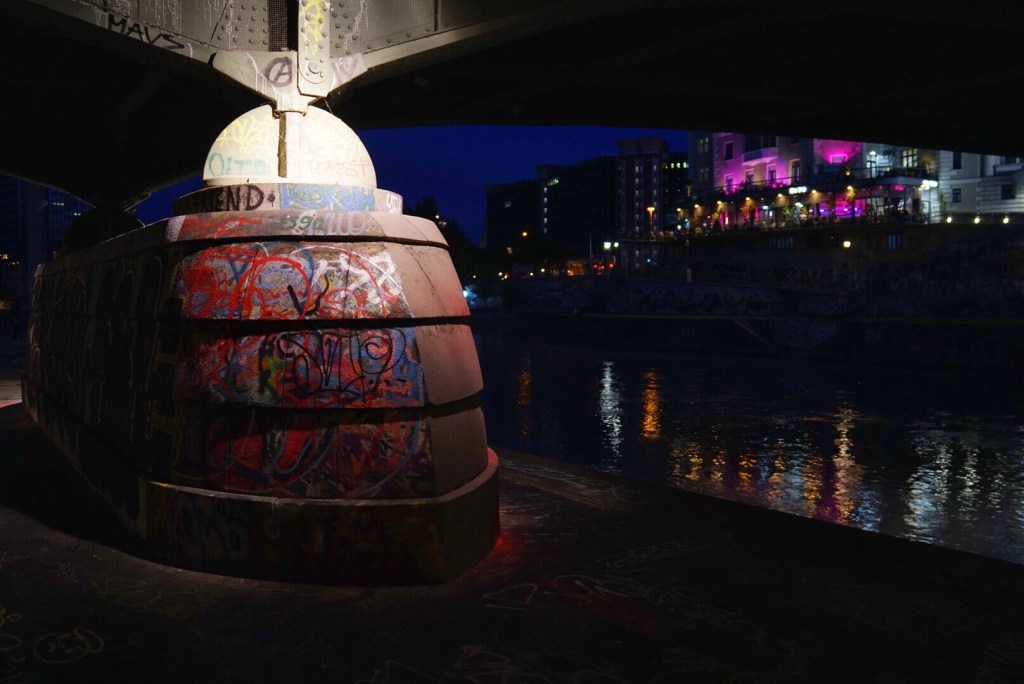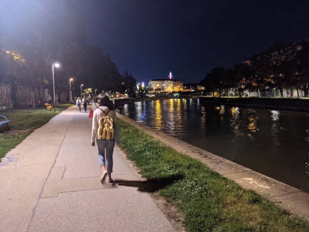 The sun had set, and we are accustomed to seeing Vienna at night having last been here for a long layover in December of 2016, when we never actually saw the sun. It was, however, extremely cold on that last visit, and it was nice to be able to walk for a distance without fear of frostbite. We walked along the canal for a bit and found that Vienna is quite lively when it’s not 10ºF. People were exercising, strolling, hanging out at pop up cafés or bars or just chilling on benches. At one point we saw an entire salsa dance class. This city is a lot more alive in August than in December, that’s for sure.