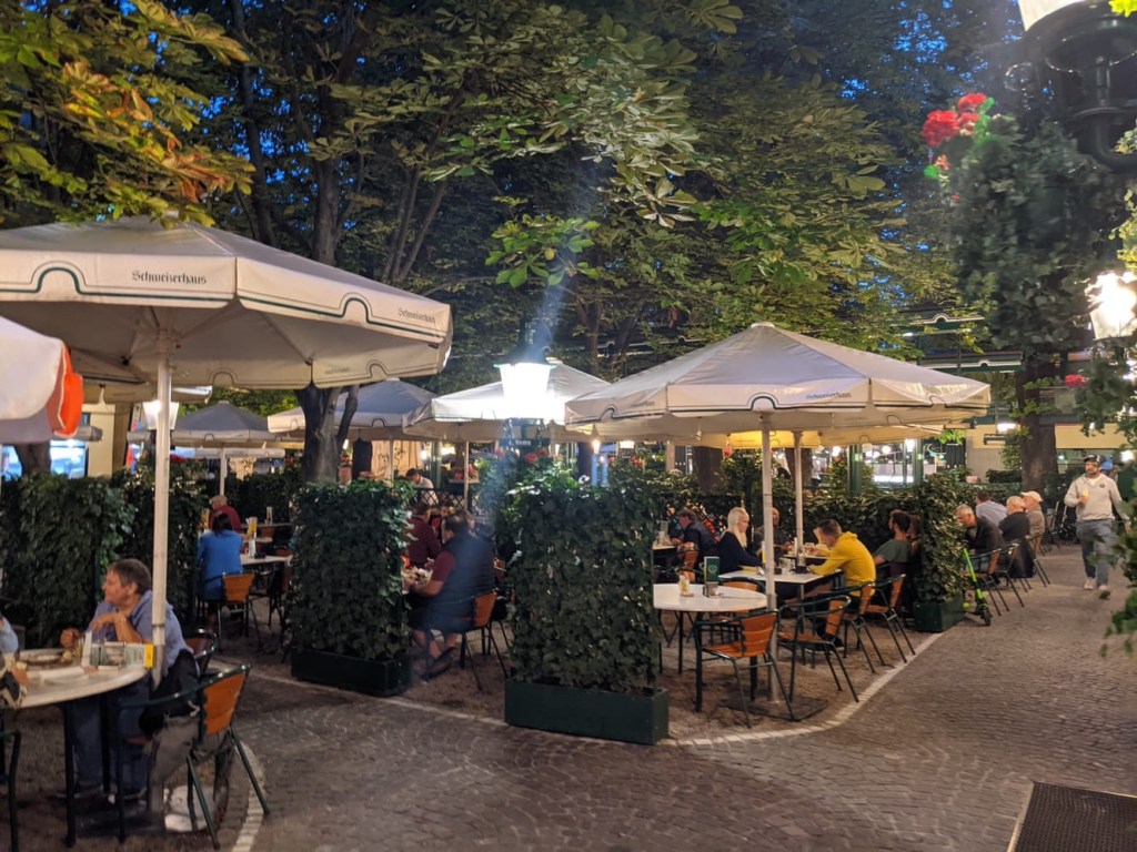 We stumbled through the menu a bit, since there were no English versions, but we did understand words like schnitzel and wurst. Our dinner of Wiener schnitzel, bratwurst mit senf (mustard), potato salad, and fries went down well. People around us were ordering the “special” which was some sort of thing called the “Knuckle,” or just a massive piece of meat. After dinner, we elected to go for a walk.