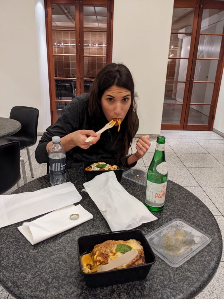 We followed along the riverfront for some time, tripping periodically over the cobblestones as we wound our way back toward Nyhavn and our hotel, the Best Western Huxley. Our next major task was to find food. There were three dilemmas. One being that a lot of the lower brow, casual eating options are closed for the weekend. Second, we really don’t like crowds, so we tried to find things on side streets, and lastly they’re really into mussels and clams and other seafoods that are likely not to fill us up. We ended up getting Italian takeaway from a place called Gnom Gnom Pasta and Sweets. While we waited for the order, we were able to find a tchotchke shop where we were able to purchase all of the necessary pins, magnets, ornaments etc. I had a lasagna and Nicole had Pasta alla Norma, which we consumed with wooden cutlery in our hotel lobby.