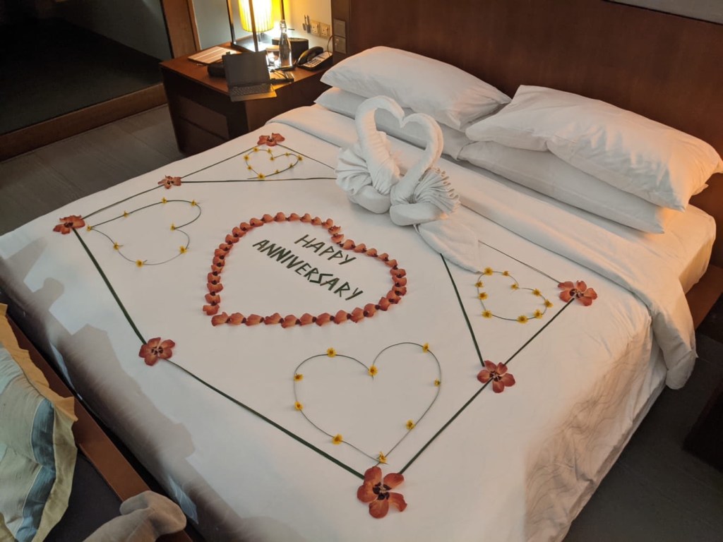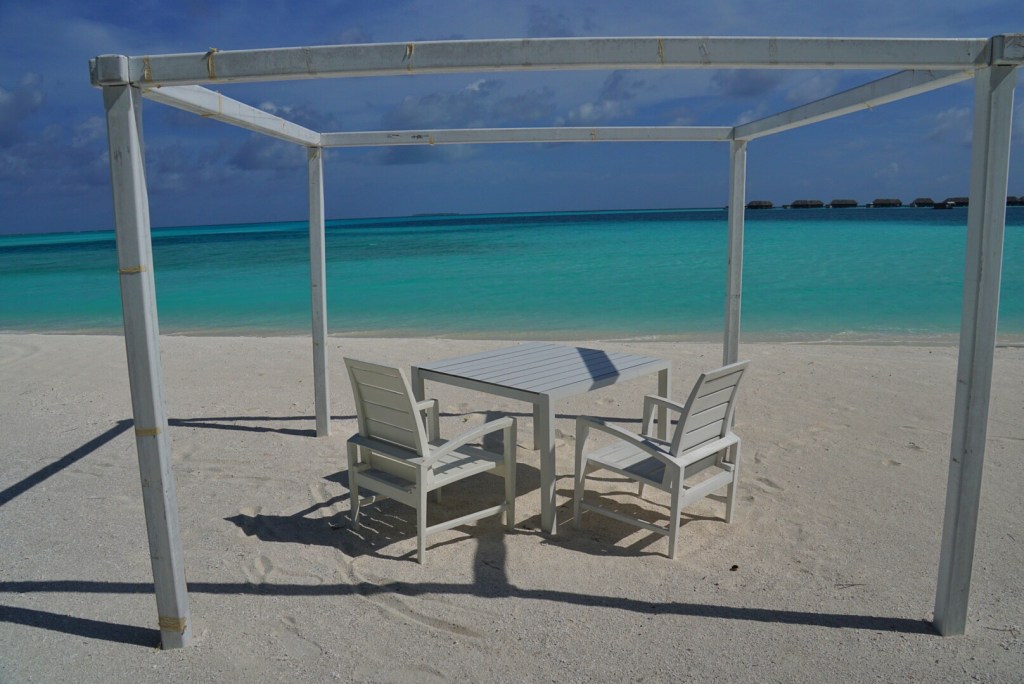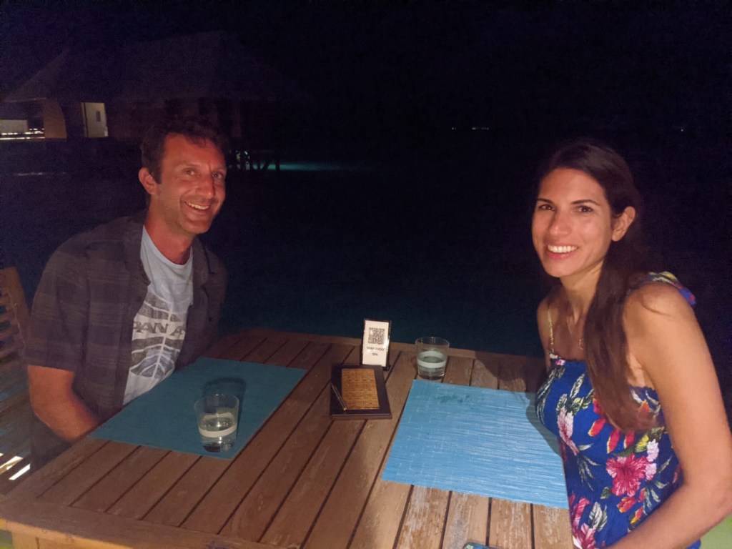We walked around a little bit after dinner before returning to our room to find flower petals AND towel animals. What. A. Find. We celebrated by opening one of our free bottles of wine and pairing it with our free chocolates and free marshmallows. We sat out on our massive patio and talked about how our lives are atypical. Especially in America, there is such an emphasis on working hard to get ahead and that anything can be accomplished with just more work. Bricole have always valued personal time and quality of life over money. It’s far more important to spend time with each other than for me to be flying 4-day trips on a 777 or Nicole to be working 12-hour days on set. “Maybe we’re doing it wrong,” said Nicole, “but we’re sitting in the Maldives right now, so I don’t think so.”