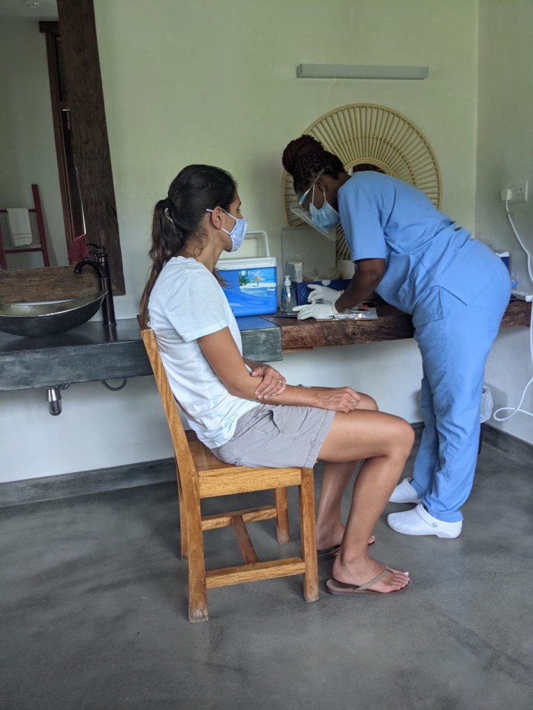 After settling in, we changed from our ferry attire of shoes and shorts into our Praslin attire of flip flops and shorts. We had a very important appointment at the Les Lauriers hotel, where we had scheduled a PCR test. We will need this to get out of the country, since we can really only go to the Emirates from here. Our planned destination of Abu Dhabi requires a negative test within the previous 48 hours. Our flight departs tomorrow afternoon and we received the test at 1230 since the nurse was running late. I couldn’t quite understand if she said she got “bit” or “hit” on the drive to the hotel. Maybe hit makes more sense, but who knows. There are quite a few bugs on this island that could slow one’s progress if they worked as a team.